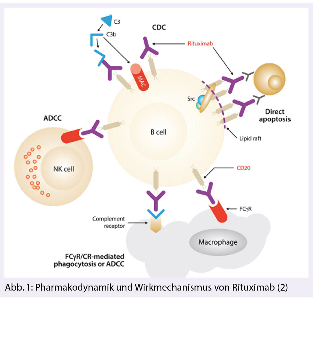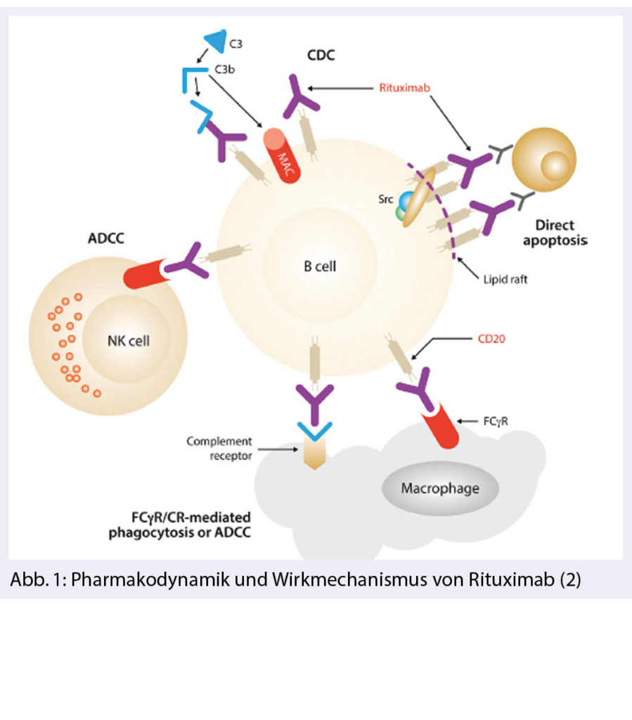Bis heute wissen wir nicht abschliessend wie R seine klinische Wirkung entfaltet. Die meisten Daten zum Wirkmechanismus stammen aus in-vitro Versuchen. Die chimärische Natur von R hat den Vorteil gegenüber monoklonalen Maus-Antikörpern, dass die Immunogenizität stark reduziert ist und somit wiederholte Anwendungen ermöglicht werden und dass R humanes Komplement C1q binden kann und durch die Komplementfixation (CDC) und Antikörper vermittelte zelluläre Toxizität (ADCC) die Tumorzellen effizienter zerstören kann. Letztere wird heute als der wesentliche Wirkmechanismus von R betrachtet. Nach der Bindung von R an CD20 wird der Komplex in der Zellmembran nach innen verschoben als Cholestrol- und Sphingolipid-reiche sog. Lipid-rafts, welche in der intrazellulären Signalauslösung die wesentliche Rolle spielen Wir haben es somit mit einer komplexen Pharmakodynamik mit einem breiten Wirkspektrum zu tun und dies ist schematisch zusammenfassend in Abb. 1 dargestellt (2).