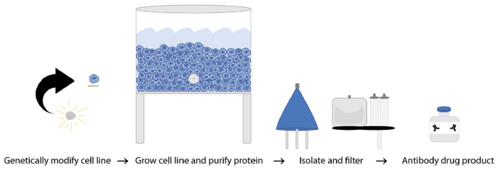 Rituximab wird industriel in grossen Mengen in Inkubationstanks aus Zellkulturen von genetisch modifizierten ovariellen Hamster-Zell-linien (OHC) hergestellt. Danach wird das Isolat in mehreren Schritten durch komplexe speziell dafür geeignete Filter weitestgehend gereinigt, um möglichst alle Fremd-Bestandteile zu entfernen (Abb. 2) (6). Es ist deshalb wichtig zu wissen, dass nie alle Chargen total identisch sein können und somit auch die Verträglichkeit variieren kann. In der Praxis hat sich jedoch die Zuverlässigkeit der Produkte mit diesem Herstellungsprozess bewährt und auch Lieferunterbrüche sind kein Problem mehr.