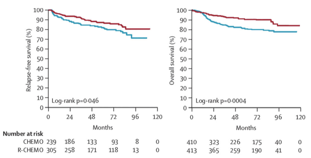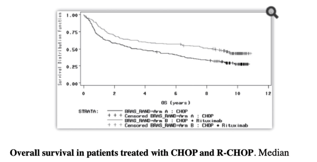 Das kurative Potential von R in Kombination mit Chemotherapie wie zb. R-CHOP ist ein Meilenstein der Onkologie für die Behandlung der Patienten mit aggressivem B-Zell Non-Hodgkin Lymphom. Bei Patienten mit fortgeschrittenem aggressivem Non-Hodgkin Lymphom aller Altersgruppen sind die Resultate eindrücklich und diese Therapie ist heute weltweit die Standardtherapie geworden. Die beiden ersten Landmark-Studien dazu für jüngere Patienten (MINT-Studie: (3). Figur 3) und ältere (GELA-Studie (4), Figur 4) wurden wiederholt publiziert nach längeren Beobachtungszeiten und belegen eindrücklich die deutlich erhöhte Heilungsrate durch die Zugabe von Rituximab zur bisherigen Chemotherapie.