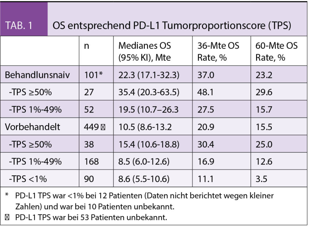 Von den nicht-vorbehandelten Patienten mit einer PD-L1-Expression von mindestens 50% war fast ein Drittel (29,6%) nach 5 Jahren noch am Leben, unter denjenigen mit einer niedrigeren PD-L1-Expression (zwischen 1 und 49%) waren es immerhin noch 15,7%.