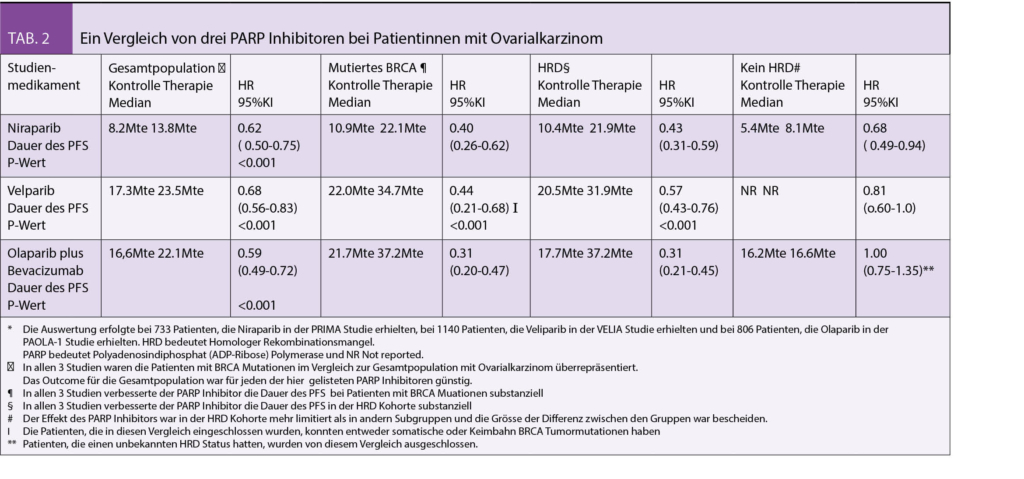 Im Dezember 2019 sind nun gleichzeitig 3 Originalpublikationen im NEJM zur Therapie der PARP-Inhibitoren bei Ovarialkarzinom erschienen (4-6). Es handelt sich um drei grosse randomisierte internationale Phase 3 Studien mit drei verschiedenen PARP-Inhibitoren: Niraprib (PRIMA-Studie), Velaparib (VELIA-Studie) und Olaparib (PAOLA-1-Studie), alle untersucht in der Indikation als Erhaltungstherapie nach erfolgreicher postoperativer 1. Linien Induktion durch ein Platin-Taxan Doublet z.T. auch mit Bevacizumab. Generell dazu ist zu bemerken, dass in der PAOLA-1 Studie Olaparib mit Bevacizumab versus Placebo mit Bevacizumab verglichen wurde und auch die Inklusionskriterien in den drei Studien differieren. Dies erklärt im Wesentlichen auch die moderaten Unterschiede in den Resultaten. Dabei fällt auf, dass diese Resultate für vergleichbare Populationen hinuntergebrochen für alle drei Substanzen dann doch wieder sehr ähnlich ausfallen. Die Zeit bis zu einem Rückfall wird durch die neuen Erhaltungstherapien mit den untersuchten drei PARP-Inhibitoren bei HDR mutierten Patientinnen ca. verdoppelt. Allerdings wurde eine lebensverlängernde Wirkung bisher für keinen der 3 untersuchten PARP-Inhibitoren nachgewiesen, bei allerdings noch zu kurzer gesamter Beobachtungszeit. Die besten Resultate ergaben sich erwartungsgemäss für BRCA1/2 mutierte Patientinnen und für die Patientinnen mit serösen und endometrialen Ovarialkarzinomen jedoch nicht bei Patientinnen mit muzinösen Ovarialkarzinomen. Neben den BRCA1/2-Mutationen gibt es ja noch weitere Störungen der homologen DNA-Rekombination (HRD), auf die heute im Tumorgewebe getestet werden kann wie hier in diesen Studien. Dabei konnte gezeigt werden, dass auch diese Patientinnen profitieren im Gegensatz zu den Patientinnen ohne nachweisebaren HRD-Defekt, die kaum oder gar nicht profitierten. Die Tabelle 2 aus dem begleitenden ausführlichen Editorial im NEJM (7) fasst die Resultate übersichtlich zusammen.