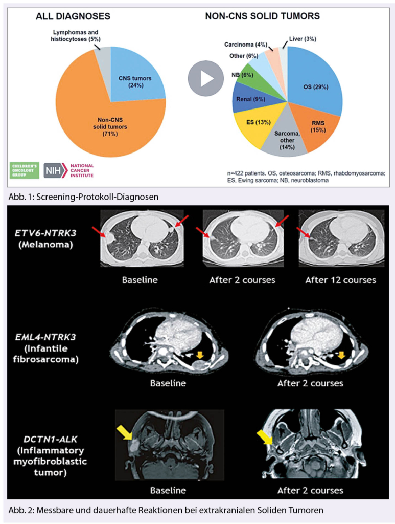 Entrectinib ist ein ZNS-gängiger oraler TrkA/B/C, ROS1 und ALK Tyrosinekinase Inhibitor. Die Wichtigkeit der Identifikation von medikamentös beeinflussbaren molekularen Zielstrukturen im pädiatrischen Setting wird durch diesen NCI-COG-Match Trial mit Entrectinib demonstriert. In dieser Studie (8) mit 29 Patienten (5 Monate bis 20 Jahre alt) mit refraktären Soliden Tumoren oder CNS-Malignomen wurde Entrectinib untersucht. Entrectinib wurde dabei generell gut toleriert: Dosis-limitierend waren erhöhtes Kreatinin, Dysgeusie, Fatigue und Lungenödem. Die empfohlene tägliche Dosisbetrug 550 mg/m2. Alle Responders hatten eine Tagesdosis ≥ 400 mg/m2. Alle 11 Kinder und Adoleszenten mit einer NTRK1/2/3, ROS1 oder ALK Fusion sowie ein Fall von Neuroblastom mit einer ALK-Mutation zeigten ein Ansprechen! Patienten ohne Nachweis des Targets von Entrectinib zeigten kein Ansprechen.