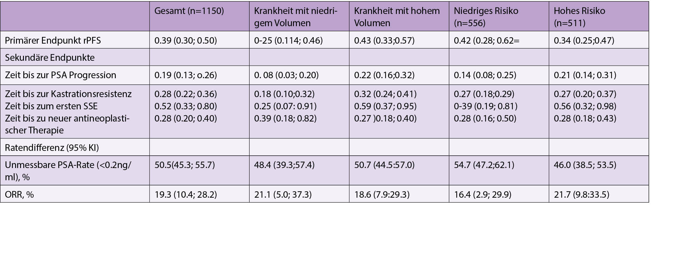Patienten mit mHSPC wurden im Verhältnis 1:1 nach ENZA (160 mg/Tag) + ADT oder PBO + ADT randomisiert. Der primäre Endpunkt war das radiographische progressionsfreie Überleben (rPFS). Sekundäre Endpunkte waren die Progression des prostataspezifischen Antigens (PSA), das Ansprechen in der radiologischen Untersuchung, Gesamtüberleben (OS) und Lebensqualität (QoL). Die Analysen wurden durch nach CHAARTED definiertes Krankheitsvolumen und LATITUDE definierte Risikogruppen komplettiert.
