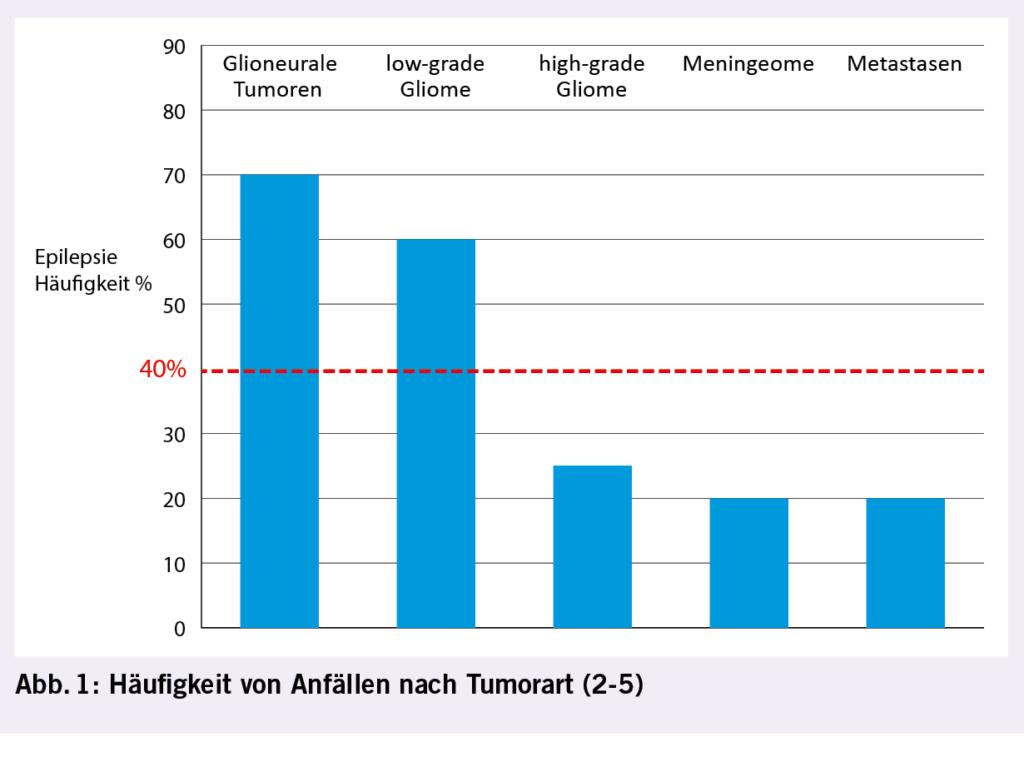 Hinsichtlich Fahreignung und Epilepsie gibt es in der Schweiz ausführliche Richtlinien (1). Bei einem hohen Risiko für das Auftreten epileptischer Anfälle (> 40% im nächsten Jahr) ist die Fahreignung in der Regel aufgehoben, auch wenn bislang Anfallsfreiheit besteht. Nach Auftreten eines epileptischen Anfalls kann eine Erst- oder Wiederzulassung als Motorfahrzeuglenker in der Regel erfolgen, wenn eine Anfallsfreiheit (mit oder ohne Antiepileptika) von einem Jahr besteht. Abb. 1 illustriert die zu erwartende Anfallshäufigkeit nach Tumorart mit der geforderten 40% Grenze (2-5).