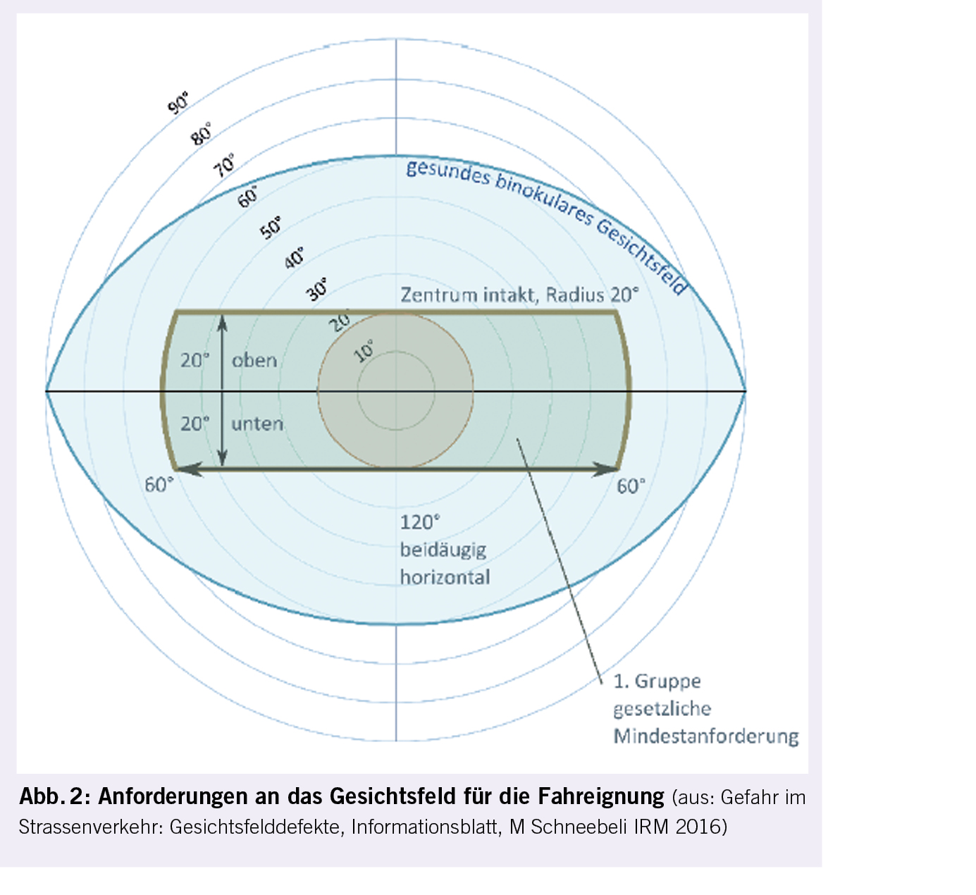 Der Fernvisus muss mindestens 0.5 beim besseren Auge und 0.2 beim schlechteren Auge betragen, bei Einäugigkeit minimal 0.6. Das Gesichtsfeld muss mindestens 120° betragen und zwar mit einer Ausdehnung nach links und nach rechts von jeweils mindestens 50°, nach unten und oben von jeweils mindestens 20°. Homonyme Hemi- oder Quadrantenanopsie sind ebenso wenig mit Fahreignung kompatibel, wie Doppelbilder. Das zentrale Gesichtsfeld (20°) muss normal sein, d.h. es dürfen keine deckungsgleichen Defekte mit einer relativen Defekttiefe von mehr als 10 dB vorliegen. Bei einäugigem Sehen muss das Gesichtsfeld bei normaler Augenbeweglichkeit normal sein (Abb. 2).