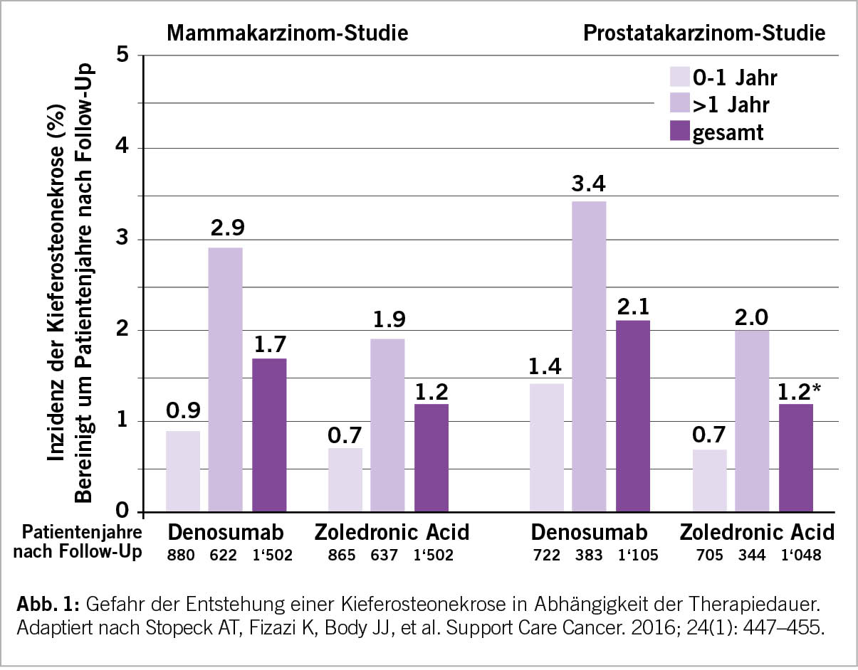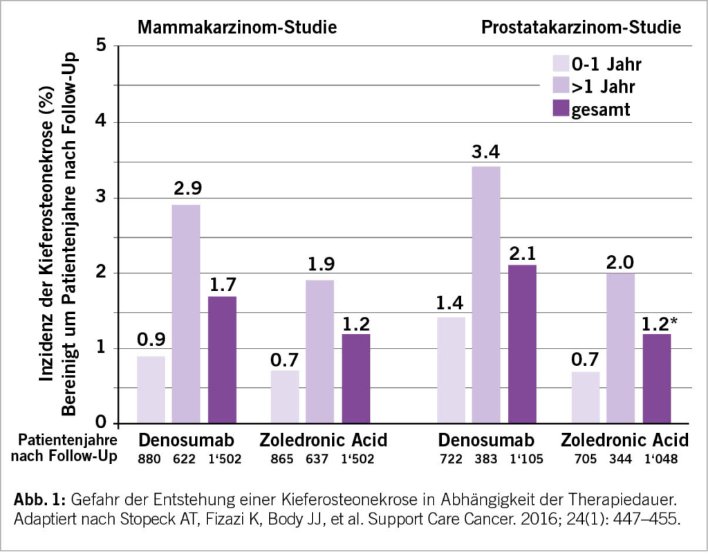 Bone targeted agents (BTAs) wie Denosumab oder Zoledronsäure werden in einer höheren Dosisintensität zur Verhinderung sogenannter skeletal-related events (SREs) bei Patienten mit kastrations-resistentem Prostatakarzinom (mCRPC) mit Knochenmetastasen geprüft und eingesetzt. Im Gegensatz dazu sind BTAs in der Behandlung von Patienten mit kastrations-sensitivem Prostatakarzinom (mCSPC) in dieser Dosis und Frequenz nicht indiziert, sondern bei Vorliegen von Risikofaktoren in der Dosis für Osteoporoseprophylaxe gegen «cancer treatment-induced bone loss» unabhängig des Vorhandenseins von Metastasen. In diesem Artikel soll ein Blick auf deren Verwendungssituation und ökonomischen Konsequenzen in der Schweiz geworfen werden.