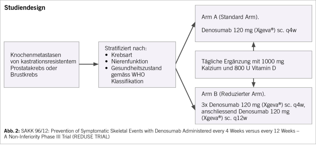 BTAs sind zurzeit ein fester Bestandteil in der Behandlung von Knochenmetastasen bei Patienten mit soliden Tumoren. Wie im Beispiel der Patienten mit mCSPC aufgezeigt, muss deren Einsatz kritisch hinterfragt werden, dies nicht nur aus ökonomischen Gründen, sondern insbesondere auch wegen der Gefahr des Auftretens einer BTA-assoziierten Kieferosteonekrose, deren Inzidenz mit zunehmender Therapiedauer deutlich ansteigt (Abb. 1). In diesem Zusammenhang stellt sich die Frage der Möglichkeit der Verlängerung des Therapie-Intervalls des heutzutage am häufigsten verwendeten BTA Denosumab. Die SAKK 96/12-Studie dürfte diese Frage beantworten, welche Denosumab alle 4 Wochen versus alle 12 Wochen bei Patienten mit Knochenmetastasen von mCRPC oder Brustkrebs vergleicht (Abb. 2). Der Grossteil der geplanten 1380 Patienten konnte zwischenzeitlich für diese Studie rekrutiert werden, sodass wir voraussichtlich im Jahre 2024 auf erste Resultate hoffen dürfen. Im Weiteren ist der Nutzen von BTAs zur Verhinderung skelettaler Ereignisse bei Patienten mit Knochenmetastasen im Zeitalter der Immuntherapien und zielgerichteten Behandlungen ungewiss. Mithilfe des SAKK-Immunregisters (SAKK 80/19 BTA study) werden wir versuchen, einen Beitrag auch zur Beantwortung dieser Frage zu leisten. Erste Daten hierzu sollen demnächst präsentiert werden.
