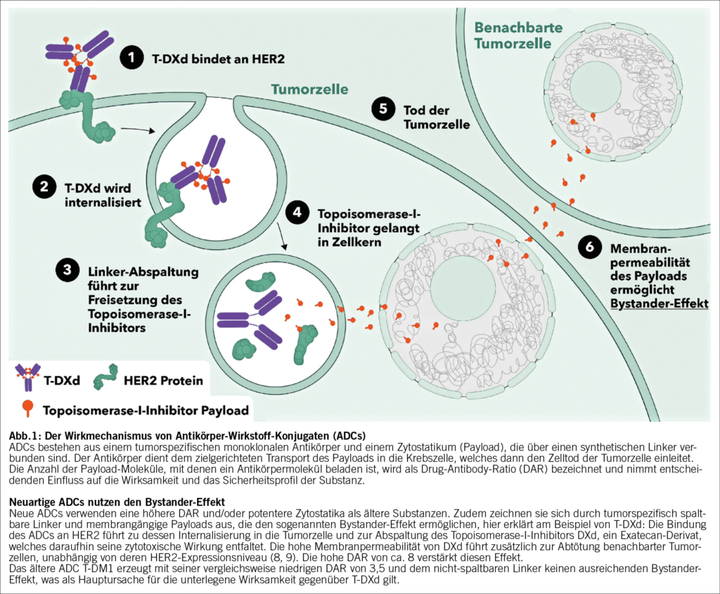 Der therapeutische Nutzen der bisherigen HER2-gerichteten Substanzen war meist auf Karzinome beschränkt, die entweder eine starke (IHC 3+) oder eine mässige HER2-Überexpression mit Genamplifikation (IHC 2+/ISH-positiv) oder eine alleinige ISH-Positivität unabhängig von Proteinexpression aufwiesen. Nur diese Brusttumore gelten daher gemäss den aktuellen ASCO/CAP-Leitlinien als HER2-positiv (4, 5). Für die Betroffenen stehen die monoklonalen Antikörper (mAbs) Trastuzumab und/oder Pertuzumab, meist in Kombination mit Chemotherapie, bereits ab dem neoadjuvanten Therapiesetting bis hin zur palliativen Situation, zur Verfügung. Antikörper-Wirkstoff-Konjugate (ADCs, antibody drug conjugates) sind eine Weiterentwicklung der mAb-Therapien und transportieren zytotoxische Wirkstoffe zielgenau an die Tumorzelle. Das erste HER2-gerichtete ADC Trastuzumab-Emtansin (T-DM1) wird heute im postneoadjuvanten Setting eingesetzt, wenn eine neoadjuvante Systemtherapie nicht zu einer pathologischen Komplettremission führt. Ausserdem war T-DM1 der Therapiestandard für die zweite Behandlungslinie des fortgeschrittenen oder metastasierten HER2-positiven Brustkrebses, bis in der DestinyBreast-03-Studie gezeigt wurde, dass das neuartige ADC Trastuzumab-Deruxtecan (T-DXd) (Abb. 1) im Direktvergleich hinsichtlich des Gesamtüberlebens (OS) signifikant überlegen war und im Juni 2022 in der Schweiz die Zulassungserweiterung für den Einsatz ab der zweiten Linie erhielt (6). Bei Progression der metastasierten Erkrankung unter den genannten Substanzen kommt in späteren Therapielinien auch der Tyrosinkinaseinhibitor Tucatinib in Kombination mit Capecitabin und Trastuzumab zum Einsatz (7).