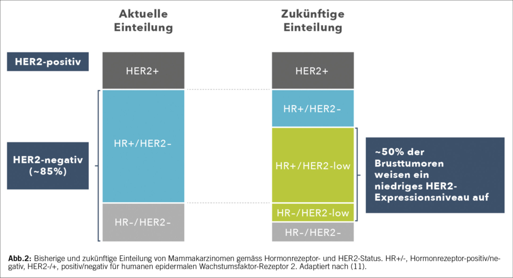 Das ADC T-DXd führte in der Phase-III-Studie DESTINY-Breast04 zu einem signifikant verlängerten PFS und OS im Vergleich zur Chemotherapie bei Mammakarzinomen mit geringer HER2-Expression (IHC 1+ oder IHC 2+/ISH-negativ), welche nach ASCO/CAP-Definition als HER2-negativ eingestuft werden (16). Diese Ergebnisse geben Anlass dazu, die binäre Einteilung der HER2-Klassifizierung zu revidieren und Brustkrebs mit niedriger HER2-Expression als dritte Entität zu erfassen, dem HER2-low-Brustkrebs (11). Etwa die Hälfte aller Karzinome, die bislang nach den Therapieleitlinien für HER2-negativen Brustkrebs behandelt wurden, fallen nun in diese neue Kategorie (Abb. 2) (11). Angesichts dieser grossen Patientinnenpopulation sind die Resultate der DESTINY-Breast04-Studie von enormer klinischer Signifikanz und führten schliesslich zur EMA-, FDA- und Swissmedic-Zulassung von T-DXd für den Einsatz beim HER2-low-Brustkrebs sowie zu einer Empfehlung in den NCCN-, ESMO- und ASCO-Behandlungsleitlinien (5, 17-19) (Abb. 1).