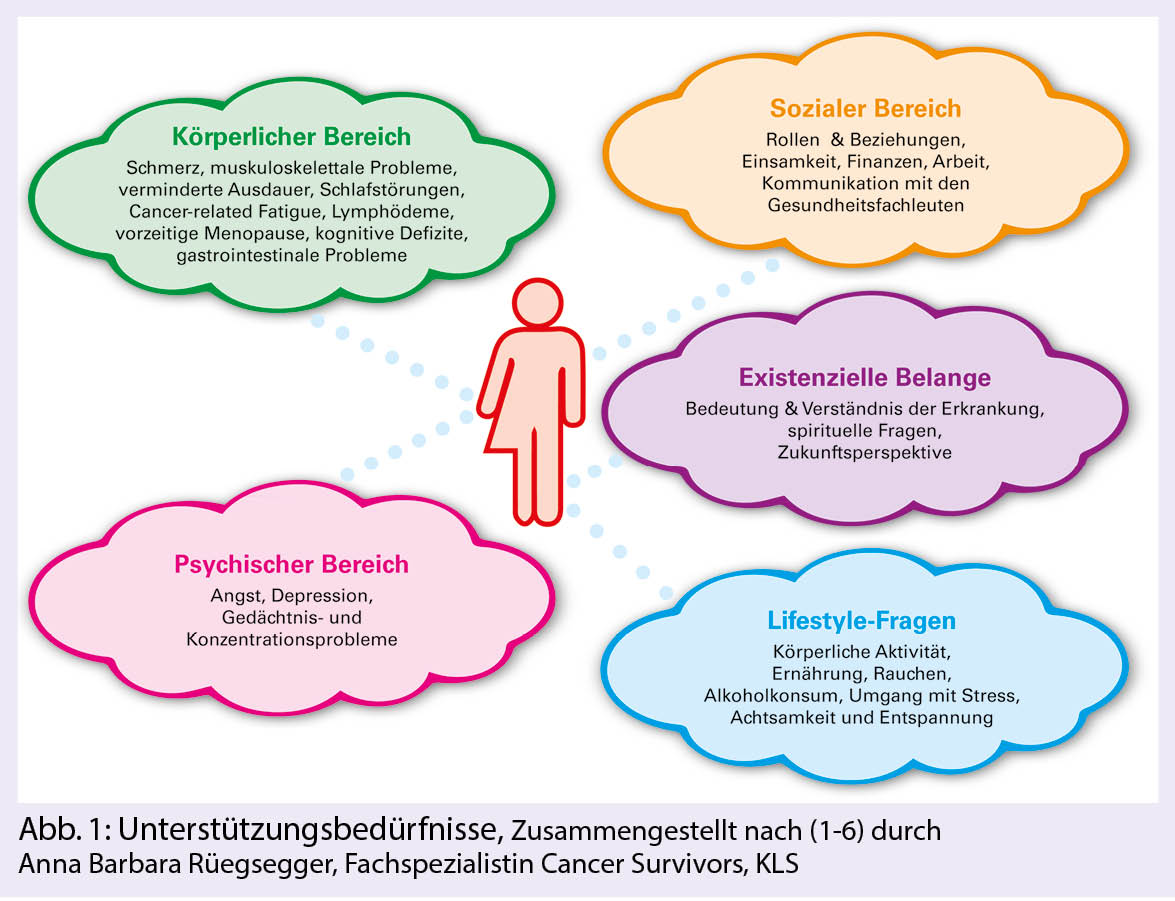 Menschen, die in ihrem Leben einmal eine Krebsdiagnose erhalten haben, leiden manchmal noch Jahre später an den psychischen oder physischen Spätfolgen der Krankheit oder der Therapien. Nicht selten lösen chronische Gesundheitsprobleme die Krebserkrankung ab. Dass die Beschwerden nach einer Krebserkrankung lange anhalten können, ist bekannt. Ebenso die Tatsache, dass man Symptome nicht immer sofort zuordnen kann. Beispielsweise kann eine Fatigue auftreten – eine chronische Müdigkeit und Erschöpfung, gekoppelt mit mangelnder Energie und erheblichen Leistungseinbussen –, aber auch kognitive Defizite wie Konzentrationsstörungen oder neuropathische Probleme wie Nervenschmerzen können entstehen. Cancer Survivors mit Beschwerden haben Unterstützungsbedürfnisse, fühlen sich aber oft alleine gelassen. In der Fachwelt lassen sich die verschiedenen Unterstützungsbedürfnisse in fünf Bereiche gliedern (siehe Abb. 1):
