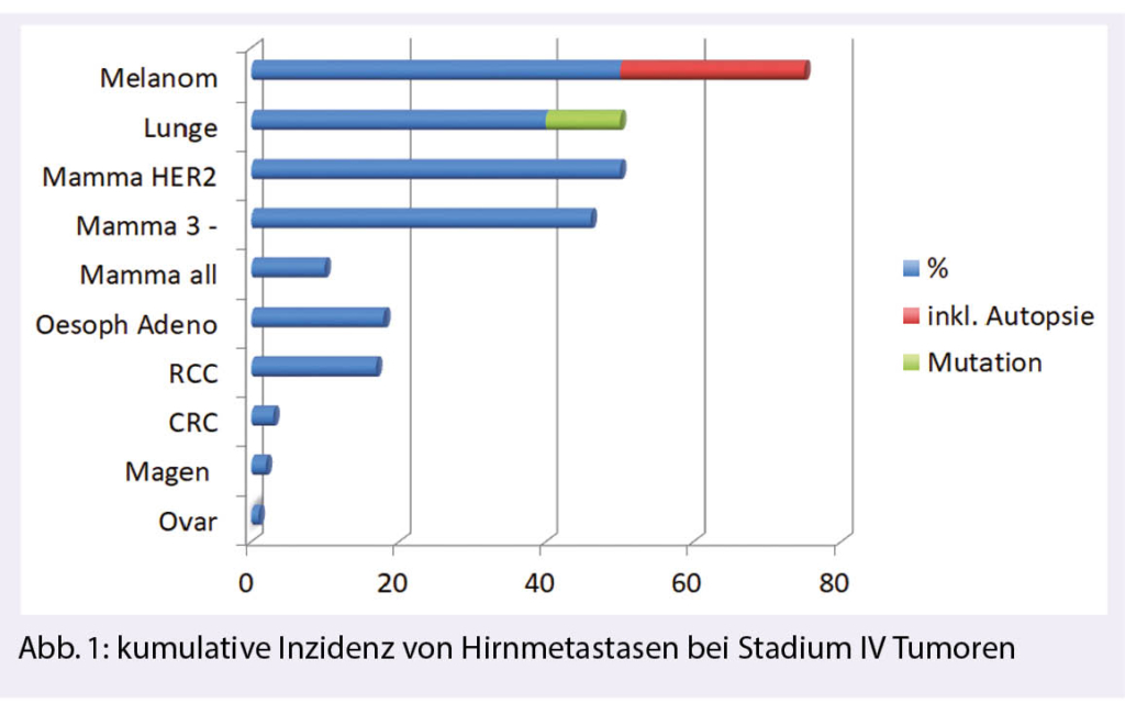 Beim metastasierten Melanom geht man von einer kumulativen Inzidenz von bis zu 80% aus, für das kleinzellige Bronchuskarzinom ist sie 50-60%, Adenokarzinome der Lunge mit einer Driver-Mutation erreichen 50-70% und beim Her2-positiven metastasierten Mammakarzinom ist sie um die 50% (Abb.1). Wir verstehen heute besser, wie sich BM molekular vom Primärtumor unterscheiden, wie wichtig das ZNS–«Microenvironment» für das Entstehen von BM ist, das sich in Zukunft vielleicht für eine Prävention nutzen lässt. BM sind in klinischen Studien nicht mehr automatisch ein «exclusion criterion», was positive Beobachtungen hinsichtlich Wirksamkeit vieler neuer Substanzen im Gehirn erst möglich macht. Der Mythos einer exklusiven Bluthirnschranke für Systemtherapien ist Vergangenheit.