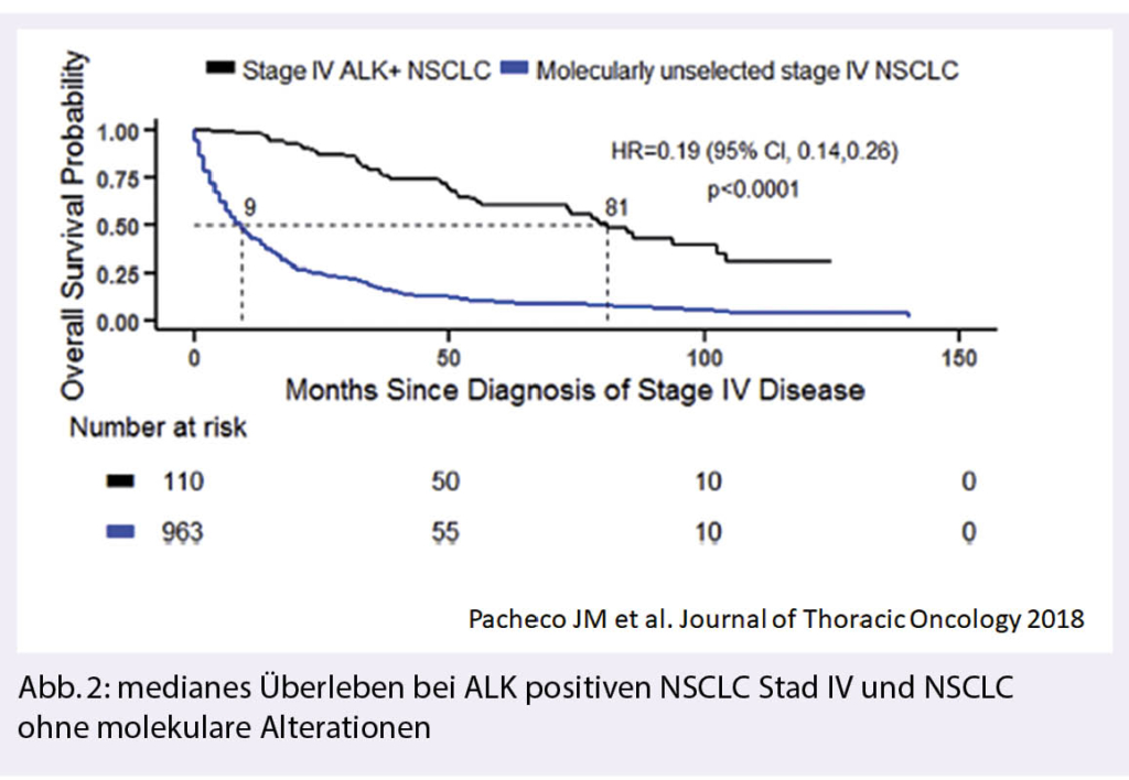 http://brainmetgpa.com (1). Prognosen variieren von einer Tumor(sub)-entität zur anderen und werden durch molekulare und klinische Faktoren beeinflusst. Klinisch spielen das Alter, der Karnofsky-Performance Status sowie das Ausmass der extrakraniellen Erkrankung eine Rolle. Die Anzahl der BM scheint bei zielgerichteten Therapiemöglichkeiten (ALK, EGFR) eher eine untergeordnete Rolle zu spielen (2). Beim ALK-positiven NSCLC mit BM wird heutzutage ein medianes Überleben von mehr als 6 Jahren erreicht unter Einsatz aller zugänglichen ALK-Inhibitoren, wohingegen bei NSCLC ohne angehbare molekulare Alterationen das mediane Überleben erst knapp über einem Jahr liegt (Abb. 2) (3).