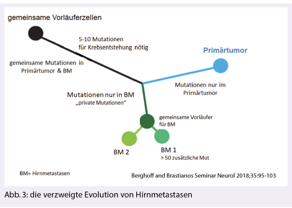 Ein Primärtumor und seine zugehörigen Hirnmetastasen (BM) zeigen unterschiedliche molekulare Alterationen, die im Verlauf der Erkrankung separat erworben werden (sogenannte «branched evolution»), diese müssen nicht identisch sein mit Metastasen in der Peripherie, welche besser zugänglich wären, um mögliche therapeutische Targets zu finden (Abb. 3) (4). Die Konkordanz von therapierbaren Driver-Mutationen im Primärtumor und den zugehörigen Hirnmetastasen ist höher bei BRAF-mutierten Melanomen, bei ALK- positiven NSCLC und etwas weniger zuverlässig bei EGFRmut NSCLC und bei Hormonrezeptor – positiven oder Her2 – amplifizierten Mammakarzinomen.