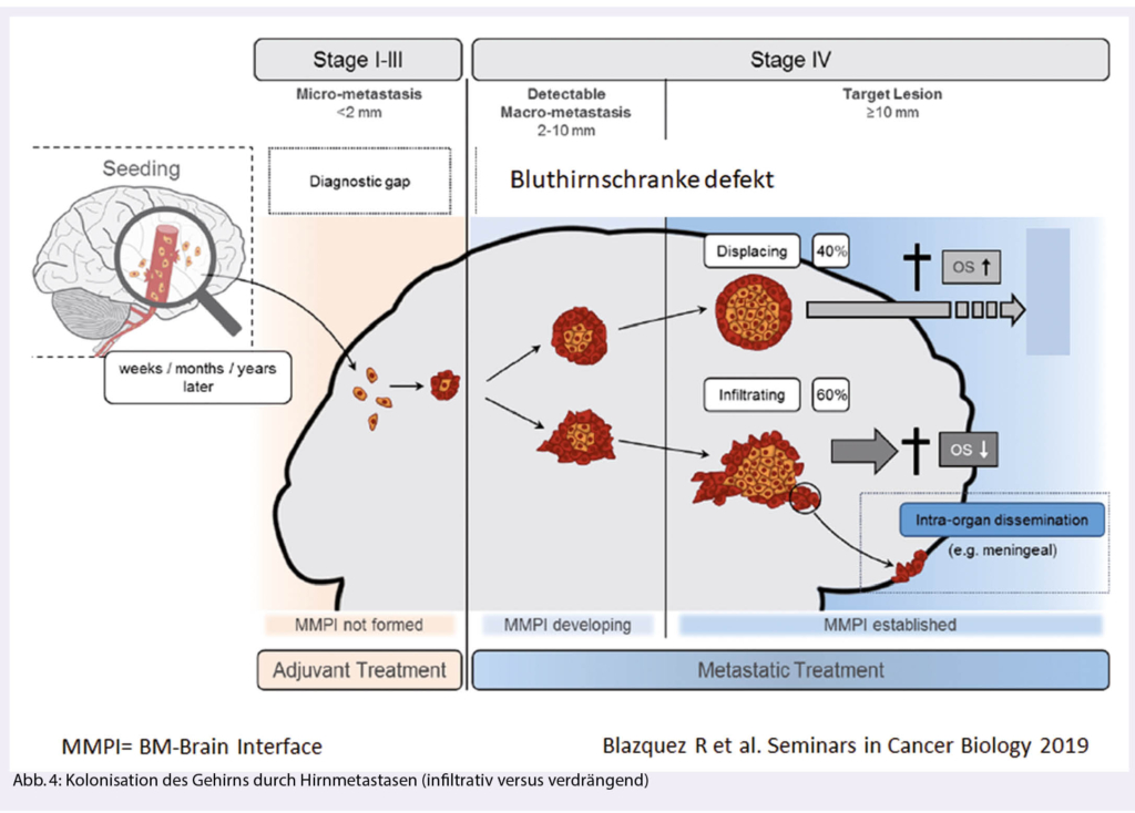 Etwa 50% der BM zeigen ein infiltratives Wachstum («glioma-like»), was sowohl die lokale Tumorkontrolle (Operation und stereotaktische Radiotherapie, SRT) als auch die Wirksamkeit der Systemtherapie beeinträchtigt (Abb. 4) (5). Infiltrierende Tumorzellen «verstecken» sich hinter einer intakten Bluthirnschranke und sind damit einer Systemtherapie weniger gut zugänglich. Eine infiltrierende Umgebungskolonisation ist typisch für Bronchialkarzinome (SCLC, NSCLC), triple negative Mammakarzinome und Melanome (6).