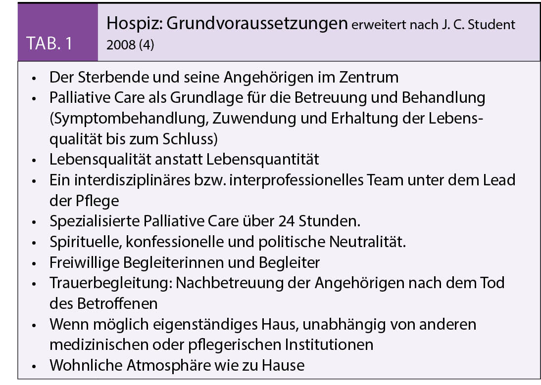 Die weitere Entwicklung, Einrichtung und Verbreitung von Hospizen sind in verschiedenen Ländern ganz unterschiedlich (5). Im Gegensatz zu Deutschland mit einer langjährigen, vorwiegend christlichen Tradition, gibt es in der Schweiz nur wenige Hospize. 16 unterschiedlich konzipierte und funktionierende Institutionen sind im Dachverband Hospize Schweiz zusammengeschlossen.