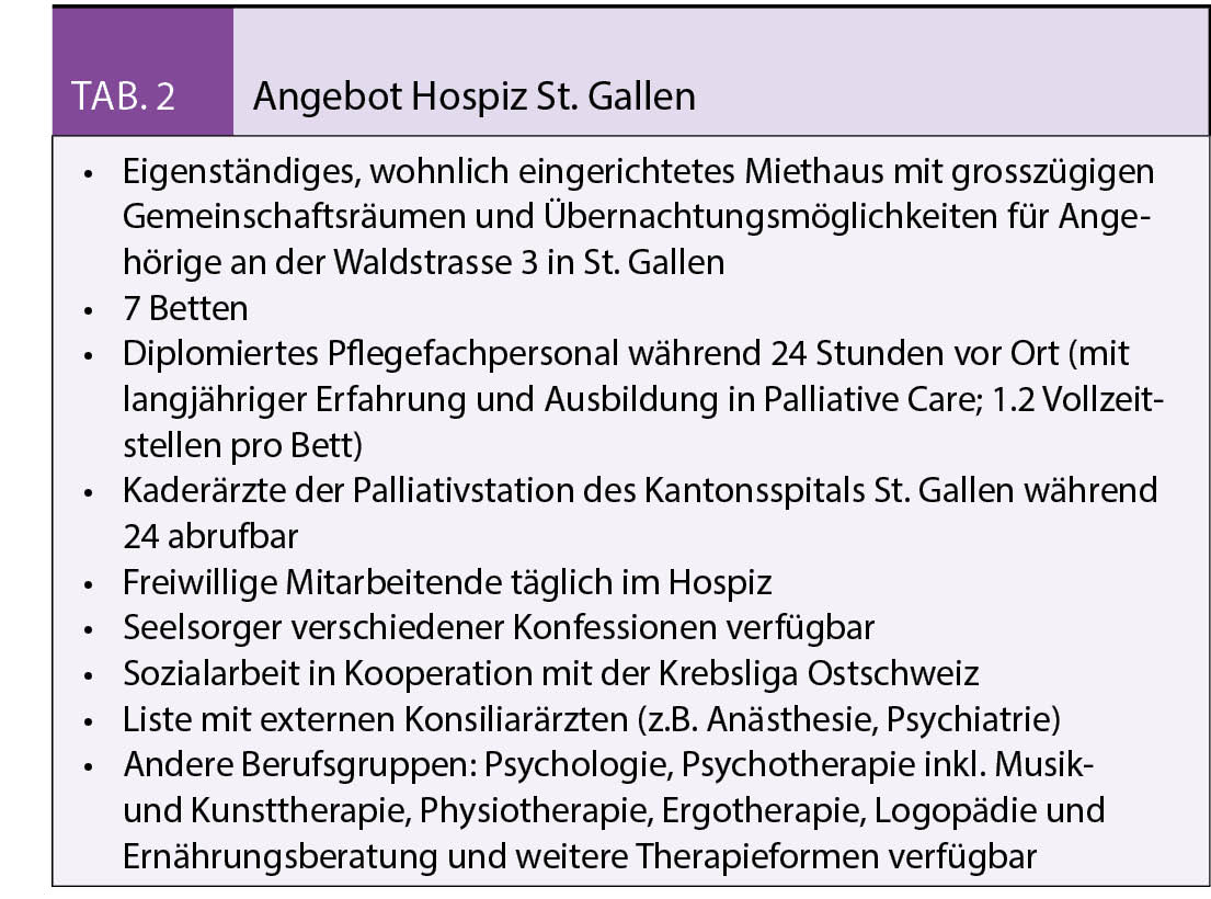 Problemlösung: Es braucht eine Langzeitinstitution mit der Qualität und den Möglichkeiten des Akutbetriebs, es braucht ein Hospiz mit spezialisierter Palliative Care (zum Unterschied von allgemeiner und spezialisierter Palliative Care siehe Abb. 1), und das war damals in St. Gallen nicht vorhanden. Das nächstgelegene Hospiz war das Lighthouse in Zürich, das wegen fehlender Nähe zum Familiennetz nicht in Frage kam. Um diesem Missstand beizukommen, haben in den letzten zehn Jahren drei Pflegefachleute der St. Galler Palliative Care unter Beizug eines Ökonomen neben ihrer Arbeit unbezahlt ein ausgereiftes Projekt zur Realisierung eines Hospizes erarbeitet. Der Bedarf in St. Gallen und angrenzenden Gebieten wurde sorgfältig abgeschätzt und liegt bei 10 bis 12 Betten mit Aufenthaltsdauer von ca. 3 Wochen und etwa 60 Bewohnenden pro Jahr. Im Hospiz soll die Atmosphäre so sein wie zu Hause und gleichzeitig eine intensive pflegerische, ärztliche, und nach Bedarf spirituelle, psychologische und soziale Betreuung mit Einbezug der Angehörigen über 24 Stunden möglich sein (Tab. 1) (6). Mit der Gründung des Vereins «Freunde stationäres Hospiz St. Gallen» wurde eine Basis für Öffentlichkeitsarbeit und das Fundraising geschaffen und schliesslich in langjähriger Fronarbeit ermöglicht, dass das Hospiz St. Gallen im Februar 2018 eröffnet werden konnte (Tab. 2).