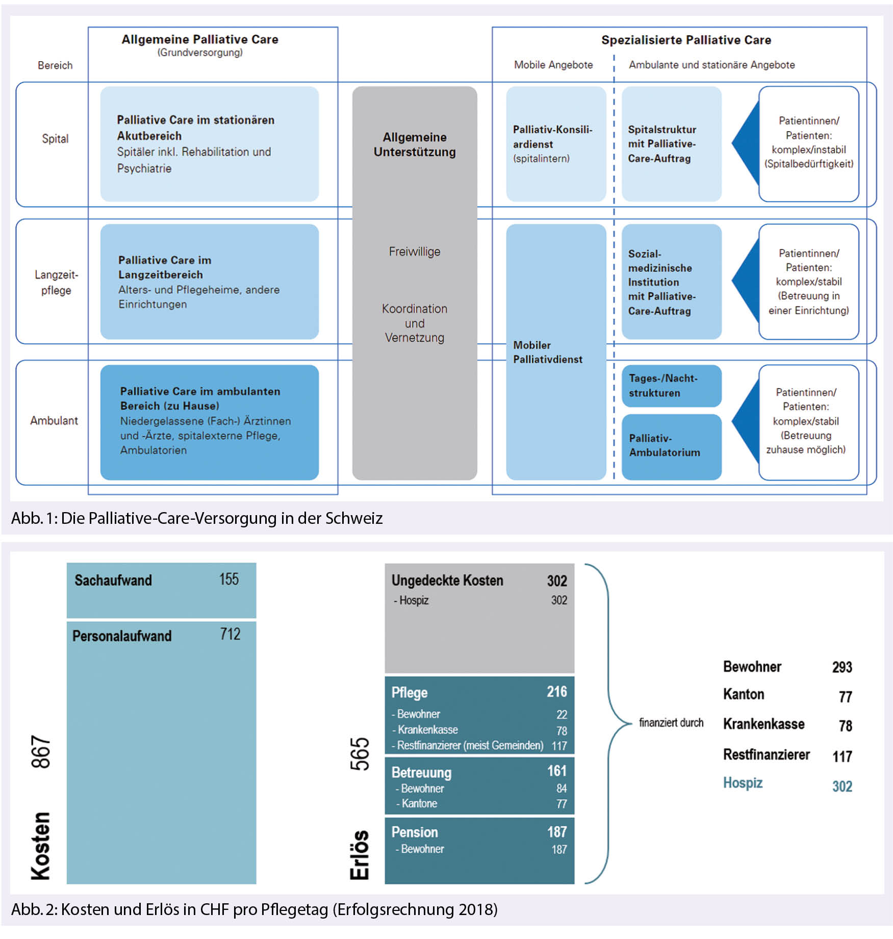 Die Finanzierung gestaltet sich schwierig. Auch nachdem der Kantonsrat im Nachtrag zum Gesundheitsgesetz vom 20. November 2018 Palliative Care inklusiv Hospize zur öffentlichen Aufgabe erklärt hat, sind die Beiträge von Gemeinden, Kantonen und Krankenkassen bei weitem nicht kostendeckend. Wie aus Abb. 2 ersichtlich kostet ein Pflegetag rund 850 Franken, mit dem Hauptanteil von 80% für das (Pflege)personal. Das muss so sein, denn im Gegensatz zum Pflegeheim braucht es im Hospiz über 24 Stunden intensive Pflege. Das Pflegeheim ist mit rund 400 Franken wesentlich günstiger. Im Vergleich zur Spitalabteilung mit 1 500 bis 2 000 Franken und einer Intensivstation mit 3 500 bis 5 000 Franken pro Tag ist das Hospiz dennoch relativ kostengünstig. Auf der Einnahmenseite berappen Bewohner, Krankenkassen, Restfinanzierer und Kanton rund 550 Franken, die restlichen rund 300 Franken muss das Hospiz durch Spenden beschaffen. Dieser Spendenbedarf macht je nach Auslastung rund eine halbe Million Franken pro Jahr.