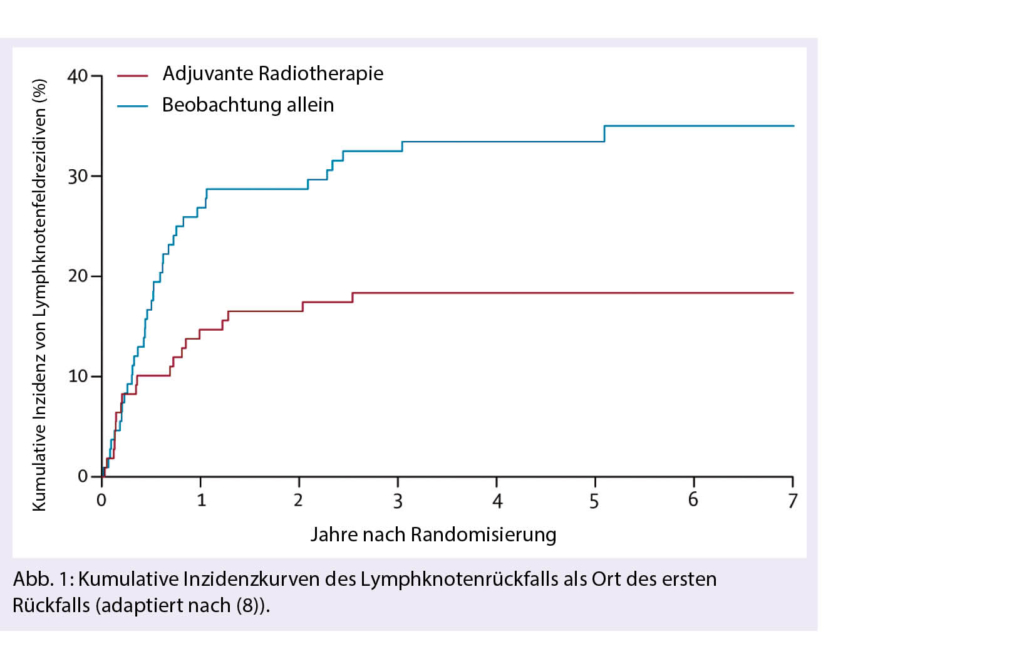 Bei Patientinnen und Patienten, welche sich mit einem lymphogen metastasierendem Melanom präsentieren, wird die Radiotherapie als adjuvante Massnahme nach kompletter regionärer Lymphadenektomie zur Verbesserung der regionären Tumorkontrolle angewendet. Die randomisierte Phase 3 Studie der Trans-Tasman Radiation Oncology Group (TROG) untersuchte den Stellenwert der postoperativen moderat hypofraktionierten Radiotherapie (48 Gy in 20 Sitzungen) der betroffenen regionären Lymphknotenstationen und konnte zeigen, dass diejenigen Patientinnen und Patienten mit hohem Rezidivrisiko (Befall von mindestens 1 Lymphknoten parotideal, mindestens 2 Lymphknoten zervikal oder axillär und mindestens 3 Lymphknoten inguinal oder Grösse des Lymphknotens ≥ 3 cm zervikal und ≥ 4 cm axillär oder inguinal) von einer adjuvanten Radiotherapie profitierten. Nach einer medianen Beobachtungszeit von 6 Jahren zeigten Patientinnen und Patienten in der Radiotherapiegruppe (n = 109) gegenüber der Beobachtungsgruppe (n = 108) signifikant weniger Erstrezidive in den regionären Lymphknoten als auch Rezidive im gesamten Beobachtungszeitraum (18% versus 33%). Bezogen auf die isolierten Rezidive in den regionären Lymphknotenstationen war der Unterschied mit 8.3% versus 23% noch deutlicher. Mit Blick auf die Fernmetastasierung, dem rezidivfreien Überleben oder Gesamtüberleben ergaben sich keine Unterschiede. Im Radiotherapiearm kam es zu häufigeren, jedoch geringgradig ausgeprägten subkutanen Fibrosierungen sowie Lymphödemen der unteren Extremitäten nach Therapie im Inguinalbereich (15% versus 7.7%) was die Lebensqualität beeinträchtigte (6-8). Aufgrund dieser Ergebnisse kann bei ausgewählten Patientinnen und Patienten mit lymphogen metastasierendem Melanom und einem hohen regionären Rezidivrisiko eine adjuvante Radiotherapie in Betracht gezogen werden, wenn auch der Preis eine höhere Morbidität darstellt (9) und die Studie in der Ära vor der zielgerichteten und immunologischen Therapie geplant und durchgeführt wurde.
