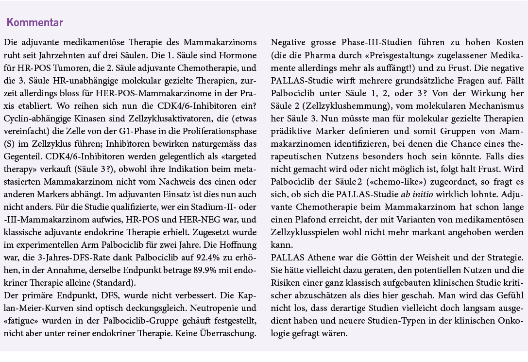 Zusammenfassung: The PALLAS trial aimed to investigate whether in patients with hormone-receptor-positive, HER2-negative, early-stage breast cancer the addition of 2 years of palbociclib to adjuvant endocrine therapy improves invasive disease-free survival over endocrine therapy alone. 3-year invasive disease-free survival was 88·2% (95% CI 85·2–90·6) for palbociclib plus endocrine therapy and 88·5% (85·8–90·7) for endocrine therapy alone (hazard ratio 0·93 [95% CI 0·76–1·15]; log-rank p = 0·51). At the planned second interim analysis, addition of 2 years of adjuvant palbociclib to adjuvant endocrine therapy did not improve invasive disease-free survival compared with adjuvant endocrine therapy alone. This regimen cannot be recommended in the adjuvant setting.