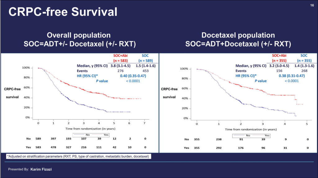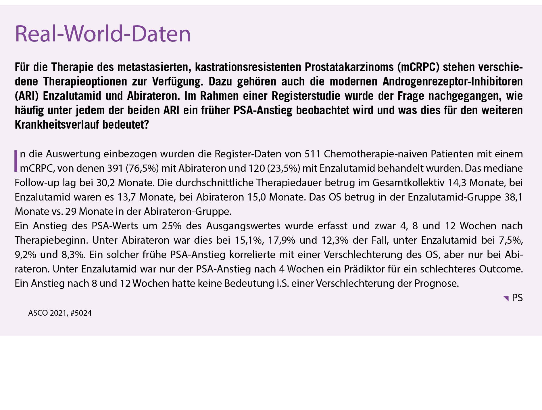 In der mehrarmigen Phase-III-Studie PEACE-1 wurde mit einen 2×2 factorial design Androgendeprivation (ADT) + / - Docetaxel (Standard of care, SOC) in Kombination mit Abirateron und Strahlentherapie (RXT) bei Patienten mit neu metastasiertem, kastrationssensitivem Prostatakarzinom (mCSPC) geprüft. Die Studie hat zwei koprimäre Studienendpunkte: das radiologische progressionsfreien Überleben (rPFS) sowie das Gesamtüberleben. Von November 2013 bis Dezember 2018 wurden 1173 Patienten, medianes Alter 67 Jahre, eingeschlossen. Davon hatten 57% eine High Volume Disease. Von allen Patienten erhielten als SOC 710 Patienten ADT+Docetaxel und 463 Patienten nur ADT. Der mediane Follow-up war 3.5 Jahre. Erste Ergebnisse bezüglich dieser beiden Arme zeigen nun eine hochsignifikante Verbesserung des rPFS im Studienarm mit Abirateron und bestätigen damit Daten aus den CHAARTED- und LATITUDE-Studien. Der Zusatz von Abirateron zu ADT + Docetaxel verbessert den Krankheitsverlauf (rPFS) der Patienten mit neu diagnostiziertem mCSPC mit einem klinisch relevanten Benefit von 2,5 Jahren (HR: 0.50 (0.40-0.62), p < 0.0001). Der Zusatz von Abiraterone zu ADT alleine sowie Abiraterone und ADT+Docetaxel (Gesamte Population) zeigte ein rPFS von 2.2 versus 4.5 Jahre (HR: 0.54 (0.46-0.64), p < 0.0001). Die Toxizität im Verum-Arm mit zusätzlich Abiraterone war nur geringfügig erhöht.