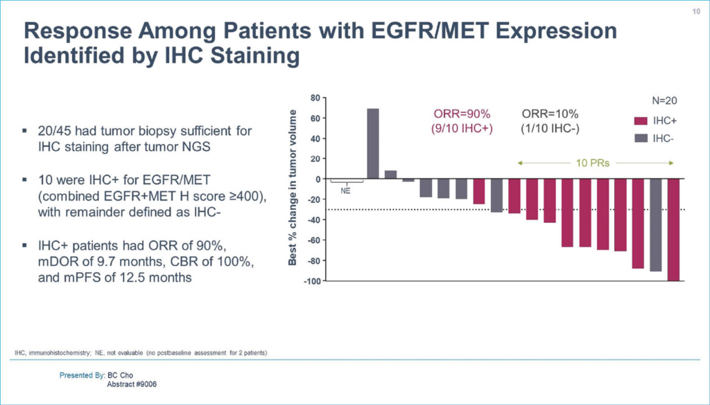 NSCLC-Patienten mit EGFR-Exon-19-Deletion oder L858R-Mutation, die unter Osimertinib ohne Chemotherapie progredient waren, wurden in die Kombinationskohorte der laufenden CHRYSALIS-Studie (NCT02609776) aufgenommen. Die Patienten erhielten 1050/1400 mg Amivantamab + 240 mg Lazertinib. Osimertinib-Resistenzmutationen oder Amplifikationen in EGFR/MET, die durch Next-Generation-Sequencing (NGS) entweder in der ctDNA oder in der Tumorbiopsie identifiziert wurden – ebenso wie die Immunhistochemie für EGFR- und MET-Expression – wurden als potenzieller Biomarker für das Ansprechen untersucht. Für die 45 Osimertinib-Rezidiv-Patienten war die OR 36% (1 CR, 15PR) und das mediane progressionsfreie Überleben (mPFS) betrug 4,9 Monate. Die genetische Untersuchung identifizierte 17 Biomarker-positive-Patienten, von denen 8 (47%) ansprachen. Von den restlichen 28 Patienten sprachen 8 (29%) an. Von diesen 28 Patienten hatten 18 unbekannte Mechanismen der Osimertinib-Resistenz (8 PR) und bei zehn wurden Nicht-EGFR/MET-Resistenzmechanismen identifiziert (OR 0%). Das mPFS für die Biomarker-positiven und die übrigen Patienten betrug 6,7 Monate.