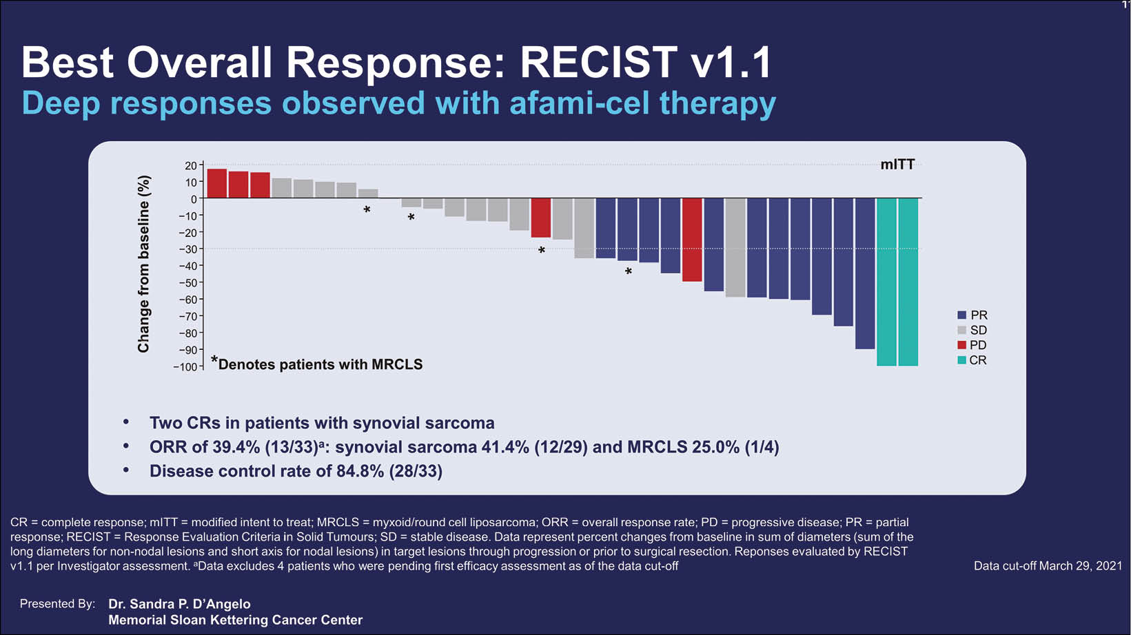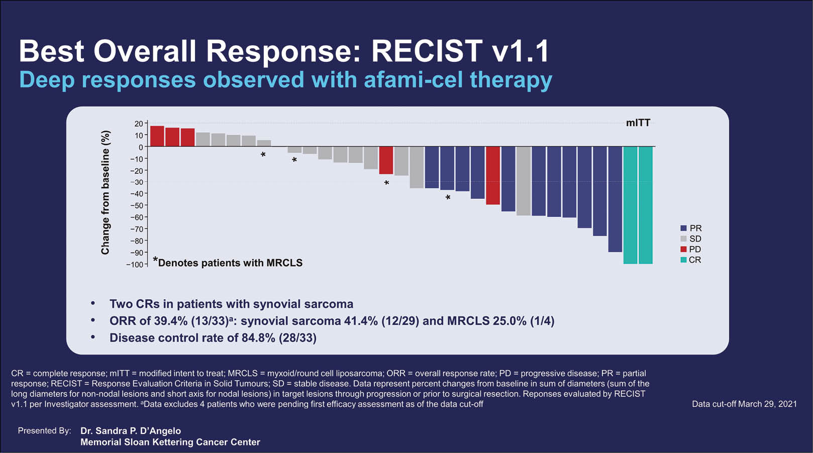 Beim Cut-off 29.3.2021 waren 37 Patienten mit Afami-cel, davon 32 mit Synovialsarkomen, und 5 mit MRCLS behandelt worden. Afami-cel wurden in Dosierungen von 1–10 × 109 transduzierten T-Zellen verabreicht, nach vorangegangener lymphozytenreduzierender Induktion mit Chemotherapie. Der Primäre Endpunkt war die Overall Response Rate (ORR). 33 Patienten konnten bereits für die OR evaluiert werden, bei 4 Patienten war die Evaluation noch zu früh.