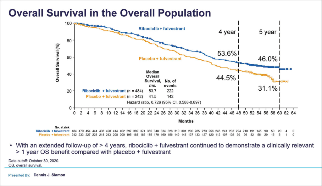 Die OS-Resultate in der ersten Linie, d.h. bei neu aufgetretenem fortgeschrittenem Mammakarzinom oder einem Rezidiv mehr als 12 Monate nach einer neo(adjuvanten) endokrinen Therapie eines frühen Mammakarzinoms, ergaben ebenfalls einen klaren Vorteil für Ribociclib (medianes OS nicht erreicht vs. 51,8 Monate in der Placebo-Gruppe; HR 0,640; 95% KI 0,464–0,883). Ein OS-Vorteil fand sich in vielen Subgruppen, auch bei Patientinnen mit Leber- oder Lungenmetastasen, drei und mehr Metastasenlokalisationen und einer klinischen endokrinen Resistenz. Eine Chemotherapie musste bei Patientinnen im Ribociclib-Arm im Median erst etwa 20 Monate später eingesetzt werden als im Placebo-Arm. Die mediane Zeit bis zur nächsten Chemotherapie lag mit Ribociclib plus Fulvestrant bei 48, mit Placebo plus Fulvestrant bei 28,8 Monate (HR 0,704; 95% KI 0,566–0,876). Das PFS 2 (von der Randomisierung bis zum zweiten Progress) betrug im Median 37,4 Monate, während es im Placebo-Arm bei 28,1 Monaten lag (HR 0,693; 95% KI 0,570–0,844). Bei Patienten mit Erstlinientherapie war dieser Vorteil noch ausgeprägter (HR 0,63; 95% KI 0,47–0,84). Dabei war der Vorteil unabhängig von der Art der Folgetherapie von Ribociclib plus Fulvestrant. Bezüglich Toxizität gab es keine neuen Sicherheitssignale. Somit wird ein klinisch bedeutsamer Überlebensvorteil nach 5 Jahren von einem Jahr auch in der Erstlinientherapie mit Ribociclib nach > 4 Jahren Follow-up bestätigt und scheint sich weiter zu vergrössern.