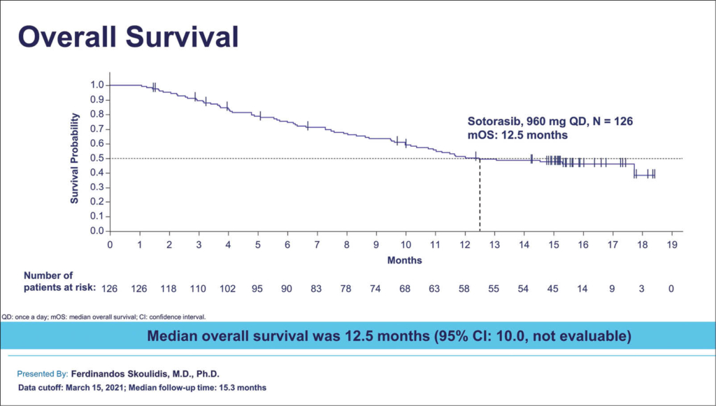 Quelle: Abstract 9003: Overall survival and exploratory subgroup analyses from the phase 2 CodeBreaK 100 trial evaluating sotorasib in pretreated KRAS p.G12C mutated non-small cell lung cancer.