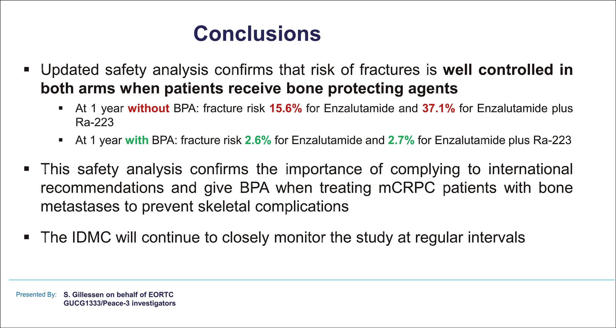 Prof. Dr. med. Silke Gillessen, Bellinzona wurden Patienten mit knochenmetastasierendem hormonrefraktärem Prostatakarzinom 1:1 randomisiert zu Enzalutamid (160 mg täglich) + Radium-223 (alle 4 Wochen für 6 Zyklen) oder Enzalutamid alleine. Dabei zeigte sich früh, dass sehr viele Knochenfrakturen speziell im Arm mit zusätzlich Radium-223, aber auch im Enzalutamid-alleine-Arm auftraten. Deswegen entschied das Data Monitoring Committee mit einem «Urgent Safety Letter», dass ab sofort bei allen Patienten knochenprotektive Medikamente wie Denosumab oder Bisphosphonate eingesetzt werden müssen.
