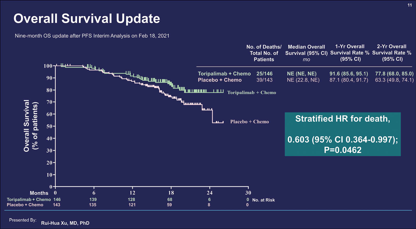 Insgesamt war die Rate der NW inklusive Grad ≥ 3 in beiden Studienarmen vergleichbar (89,0% versus 89,5% mit Placebo). In der Verum-Gruppe brachen etwas mehr Patienten als in der Placebo-Gruppe die Therapie wegen NW ab (7,5% vs. 4,9%); Todesfälle wegen NW waren in beiden Gruppen selten (2,7% vs. 2,8%). Die Ansprechrate war 77,4% für den Arm Toripalimab + GC und 66,4% für den Kontrollarm (p = 0,0335). Die mediane Ansprechdauer betrug 10,0 versus 5,7 Monate (HR = 0,50; 95% KI 0,33–0,78). Toripalimab+GC zeigte eine Verlängerung des medianen PFS von 11,7 Monaten gegenüber 8,0 Monaten für den Kontrollarm. Das PFS nach einem Jahr betrug 49,4% versus 27,9% im Placebo-Arm der Studie. Die HR lag bei 0,52 (95% KI 0,36–0,74; p = 0,0003). Der Effekt war unabhängig von der PD-L1-Expression. Die Kaplan-Meier-Kurve des OS zeigte bereits einen Vorteil. Das mediane OS ist zwar in beiden Gruppen noch nicht erreicht, die stratifizierte HR liegt aber im Februar 2021 bereits bei 0,603 (95% KI 0,364–0,997; p = 0,0462). Nach 2 Jahren lebten 77,8% der Patienten im Interventions- und 63,3% der Patienten im Standardarm der Studie. Toripalimab ist in China bereits in der 3. Linie zugelassen und die FDA prüft nun ein beschleunigtes Zulassungsverfahren.