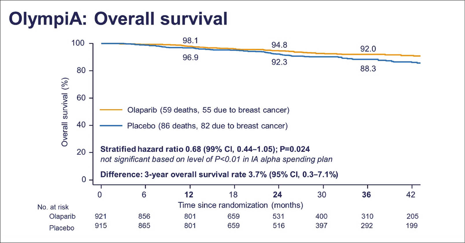 Der primäre Endpunkt der Studie wurde bereits zu diesem frühen Zeitpunkt erreicht: im Olaparib-Arm war eine 42%ige Risikoreduktion für das iDFS dokumentiert. Die geschätzte Rate des iDFS nach drei Jahren lag in der Placebogruppe bei 77,1%, in der Olaparib-Gruppe bei 85,9%. Der Unterschied von 8,8% war statistisch signifikant (HR 0,58; 95% KI: 0,41–0,82; p<0,0001). Auch die Raten des auf drei Jahre bezogenen dDFS waren signifikant besser mit 80,4% in der Placebo- und 87,5% in der Olaparib-Gruppe (HR 0,57; 95% KI 0,39–0,83; p<0,0001). In beiden Fällen begannen sich die Überlebenskurven zu separieren. Trotz häufigerer NW war die Lebensqualität der Patientinnen, gemessen mit dem Instrument EORTC QLQ-C30 Global Health, mit Olaparib vergleichbar bezüglich Placebogruppe.