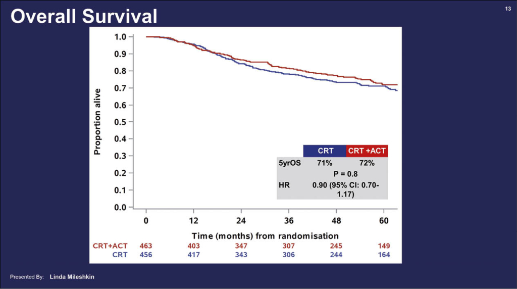 Diese international randomisierte Phase-III-Studie OUTBACK untersuchte bei Patientinnen mit lokal fortgeschrittenem Zervixkarzinom mit FIGO-2008-Stadium IB1 (mit Lymphknotenbefall), IB2, II, IIIB oder IVA, die für eine Standard-Strahlenchemotherapie in kurativer Intention infrage kamen, ob Carbo-Taxol adjuvant nach einer kurativ intendierten Standardtherapie das Gesamtüberleben verbessert. Randomisierte Patientinnen erhielten entweder die Standardtherapie (Kontrollgruppe, n=456) oder zusätzlich adjuvant vier Zyklen Carboplatin/Paclitaxel (ACT: n=463). Primärer Endpunkt der Studie war das Gesamtüberleben OS nach 5 Jahren. Die ACT-Gruppe zeigte zusätzlich die typischen Nebenwirkungen der Chemotherapie: Grad 3-5 Nebenwirkungen über die ersten zwölf Monate nach Randomisierung traten bei 81% und in der Kontrollgruppe bei 62% der Patientinnen auf. Nach einem Jahr litten Patientinnen aus dem ACT-Arm immer noch häufiger an einer Polyneuropathie als Patienten der Standardgruppe (7% vs. 2% sensorische Polyneuropathie Grad 2). Fünf Jahre überlebten in der Standardgruppe 71%, in der ACT-Gruppe 72% der Patientinnen, (HR 0,90; 95% KI: 0,70–117; p=0,8). Auch das PFS zeigte keinen Vorteil für die ACT-Gruppe (HR 0,86; p=0,06). Es fand sich auch kein Unterschied in der Art der Rezidive: vergleichbar viele Patientinnen in beiden Gruppen entwickelten Fernmetastasen. In Subgruppenanalysen fand sich auch bei besonders hohem Rezidivrisiko kein Unterschied.