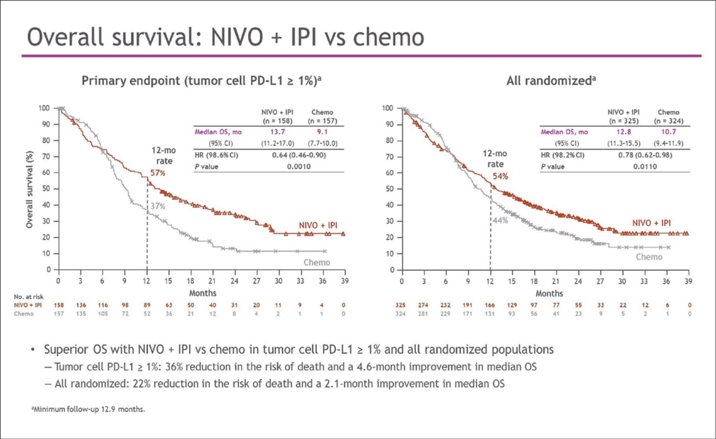 Primäre Endpunkte der Studie waren OS und PFS. Knapp die Hälfte der Patienten wies eine PD-L1-Expression auf. Die minimale Beobachtungszeit dieser Analyse betrug 12,9 Monate ab Randomisierung. Die Toxizität entsprach den erwarteten typischen Nebenwirkungen:   im Nivolumab-Chemotherapie-Arm und Chemotherapie-Arm Nausea, Appetitverlust und Stomatitis, im Nivolumab-Ipilimumab-Arm Pruritus, Hautausschläge und Hypothyreoidismus. Neue Sicherheitssignale wurden nicht beobachtet und die Anzahl der behandlungsbedingten Todesfälle war in allen drei Armen ausgeglichen und gering.