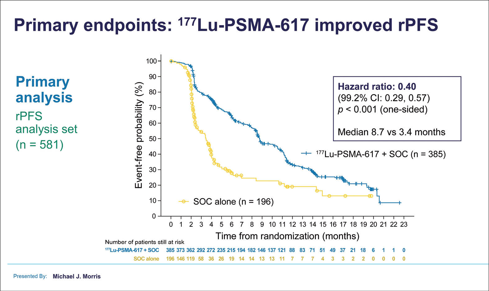 177Lu-PSMA-617 bindet mit hoher Affinität an das prostataspezifische Membranantigen (PSMA) und wird durch Endozytose als therapeutisches Isotop in die Tumorzellen aufgenommen. In den Tumor- sowie in den umgebenden Zellen führt 177Lu-PSMA-617 durch DNA-Schäden zum Zelltod. Die Ergebnisse der randomisierten, offenen Phase-III-Studie VISION zeigen, dass 177Lu-PSMA-617 zusätzlich zur Standardtherapie bei Patienten mit metastasiertem kastrationsresistenten Prostatakarzinom (mCRPC) zu einem signifikant besseren Überleben ohne radiographisch dokumentierte Progression in der Bildgebung (radiographic Progression Free Survival, rPFS) führt. Untersucht wurden Männer mit einem PSMA-positiven mCRPC, die zuvor bereits neuere Androgenrezeptor-Inhibitoren und ein bis zwei Taxan-Regimes erhalten hatten. PSMA-positiv waren Tumoren, wenn in 68Ga-PSMA-11-Scans die Werte höher als in der Leber waren. Die Randomisierung erfolgte 2:1 in eine Behandlungsgruppe mit 177Lu-PSMA-617 (7,4 GBq alle 6 Wochen x 6 Zyklen) (n = 551) und eine Gruppe mit Standard Of Care (SOC) alleine (n=280) zusätzlich zur Standardtherapie. Die SOC wurde durch den jeweiligen Untersucher festgelegt, wobei eine zytotoxische Chemotherapie oder eine Radium-223-Behandlung ausgeschlossen waren. Es gab zwei primäre Endpunkte: das rPFS und das OS.