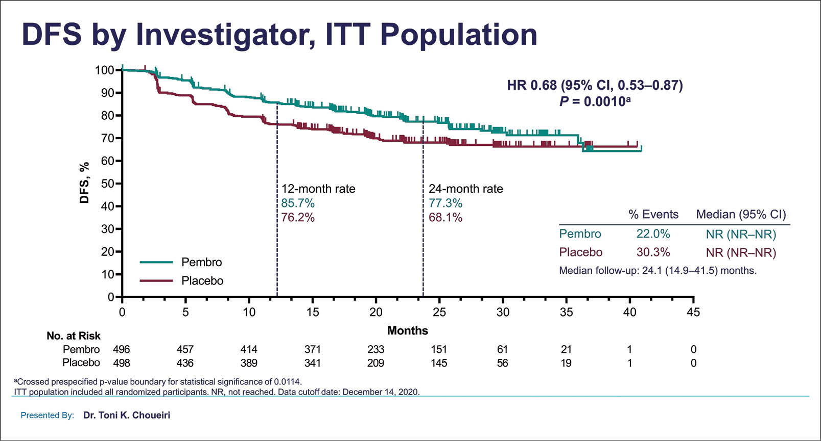 Quelle: LBA5: Pembrolizumab versus placebo as post-nephrectomy adjuvant therapy for patients with renal cell carcinoma: Randomized, double-blind, phase III KEYNOTE-564 study.