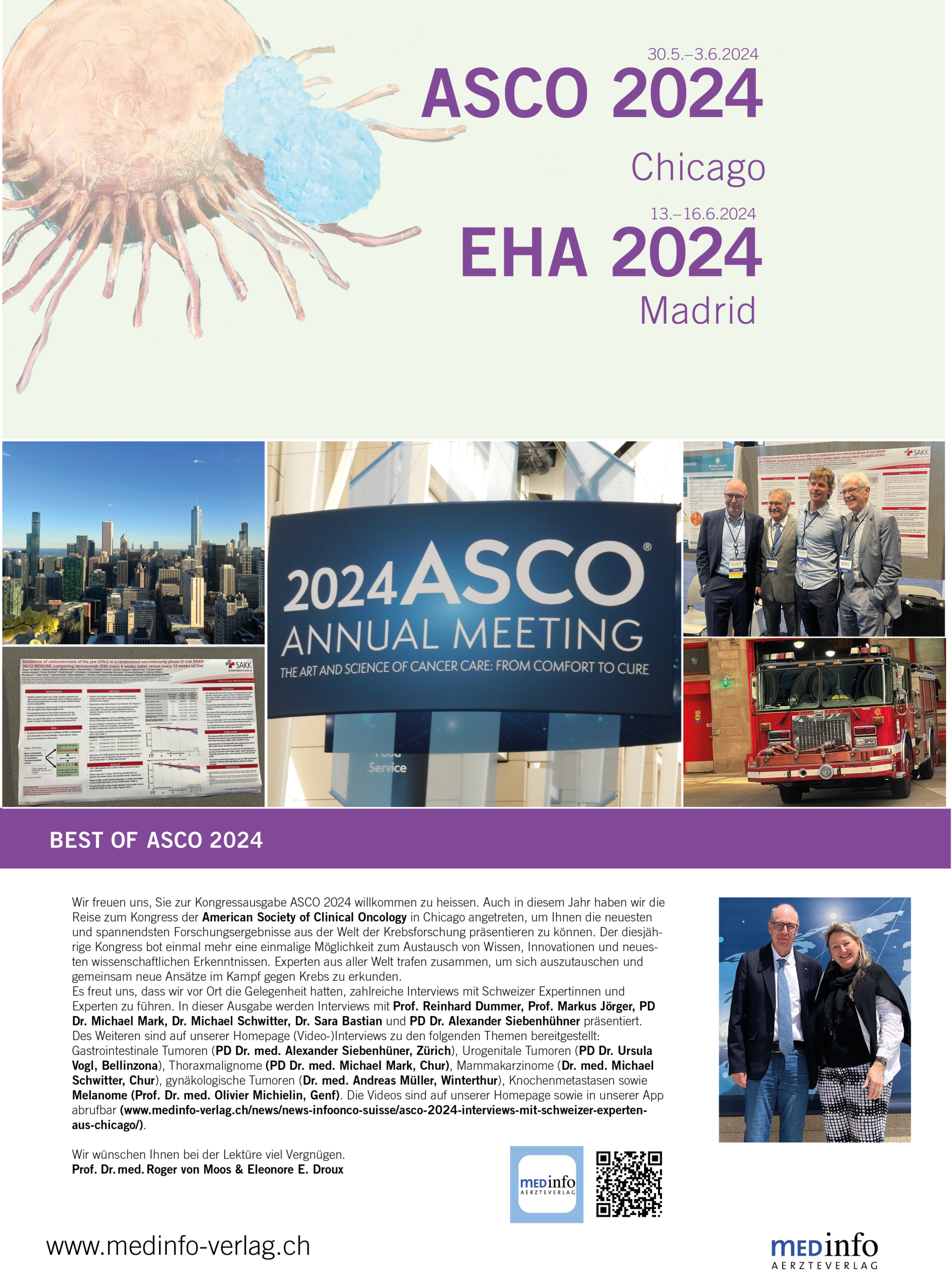 Ich hoffe, mit diesen aus meiner Sicht sehr relevanten Studien Ihr Interesse an dem EHA Kongress und somit auch dem vorliegenden Heft geweckt zu haben. Zudem wünsche ich Ihnen viel Spass bei der Lektüre und gehe davon aus, dass viele Kolleginnen und Kollegen am nächsten EHA Kongress 2025 in Mailand vor Ort sein werden.