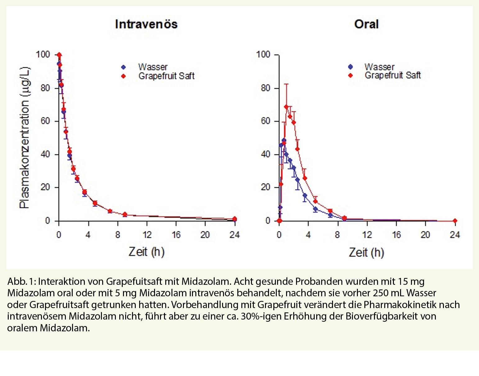 Die Interaktion von Grapefruitsaft mit Midazolam ist in der Abb. 1 illustriert. Gesunde Probanden wurden mit 250 mL Grapefruitsaft oder Wasser vorbehandelt und der Effekt auf die Pharmakokinetik von oral oder intravenös verabreichtes Midazolam untersucht. Ein Effekt von Grapefruit war nur nach oraler Gabe von Midazolam sichtbar, was beweist, dass Grapefruit auf das CYP3A4 im Darm, nicht aber in der Leber, wirkt. Nach oraler Gabe von Midazolam kam es durch Grapefruit ungefähr zu einem 30%-igen Anstieg der Bioverfügbarkeit, was die Sedation der Probanden verstärkte (4).