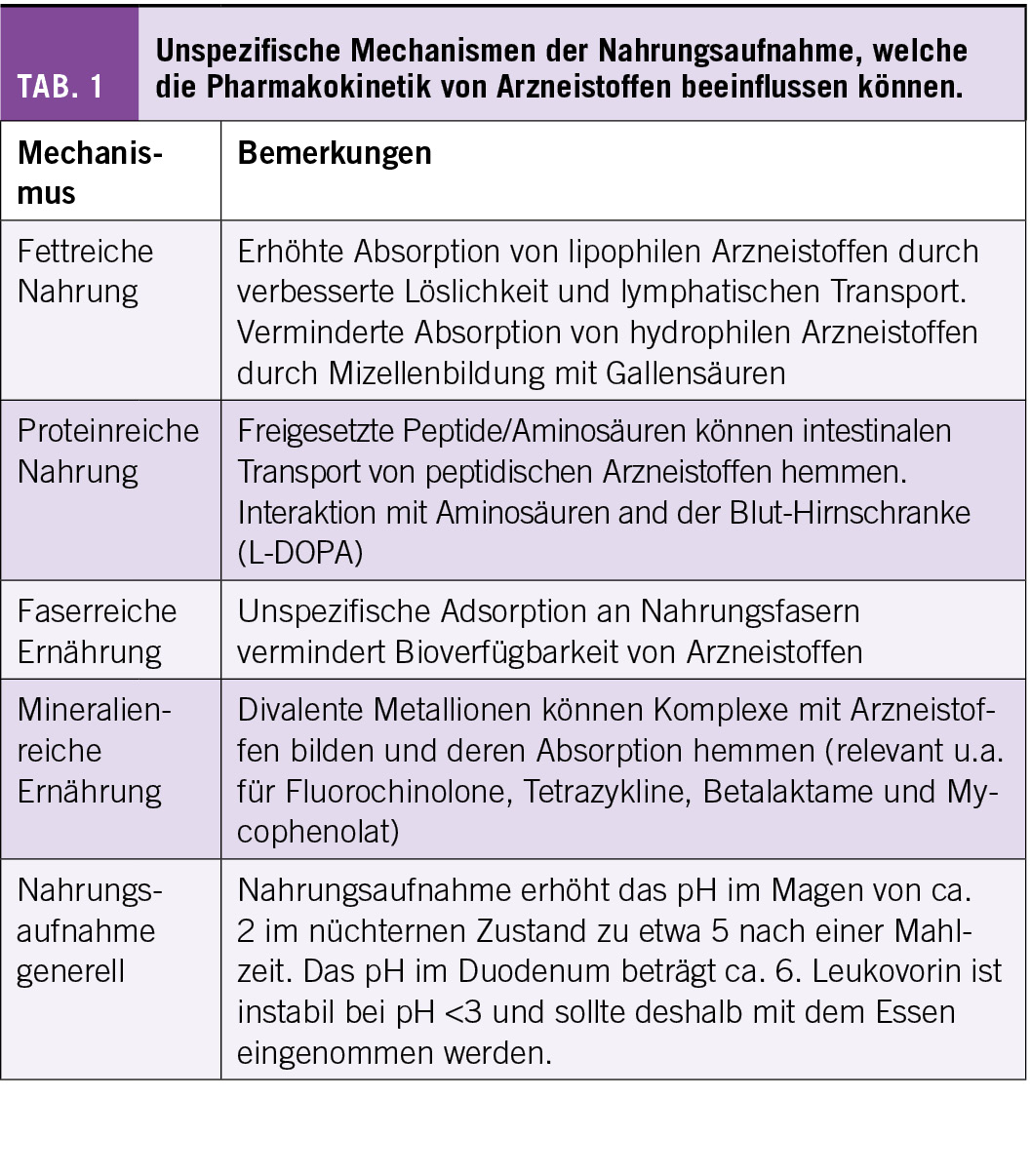 Die wichtigsten Mechanismen, welche zu einer Interaktion der Nahrungsaufnahme mit Arzneistoffen führen, sind in Tabelle 1 aufgelistet. Fettreiche Nahrung hemmt die Magenentleerung, was in den meisten Fällen zu einer Erhöhung der Tmax führt, die Exposition aber nicht beeinträchtigt. Die Exposition kann sich v.a. für sehr lipophile Arzneistoffe erhöhen, einerseits wegen verbesserter Löslichkeit und dann auch wegen möglicher Absorption via Lymphe. Fettreiche Ernährung führt auch zu einer Sekretion von Gallensäuren in das Duodenum, was die Dünndarmepithelien für die Penetration von Arzneistoffen durchlässiger macht. Auf der anderen Seite kommt es zur Bildung von Mizellen, was die freie Konzentration von Arzneistoffen und damit die intestinale Aufnahme senken kann. Generell kann davon ausgegangen werden, dass der Effekt der Nahrungsaufnahme bezüglich Zunahme der Exposition für schlecht wasserlösliche, aber gut penetrierbare Arzneistoffe am Ausgeprägtesten ist, da die Löslichkeit verbessert werden kann (3).