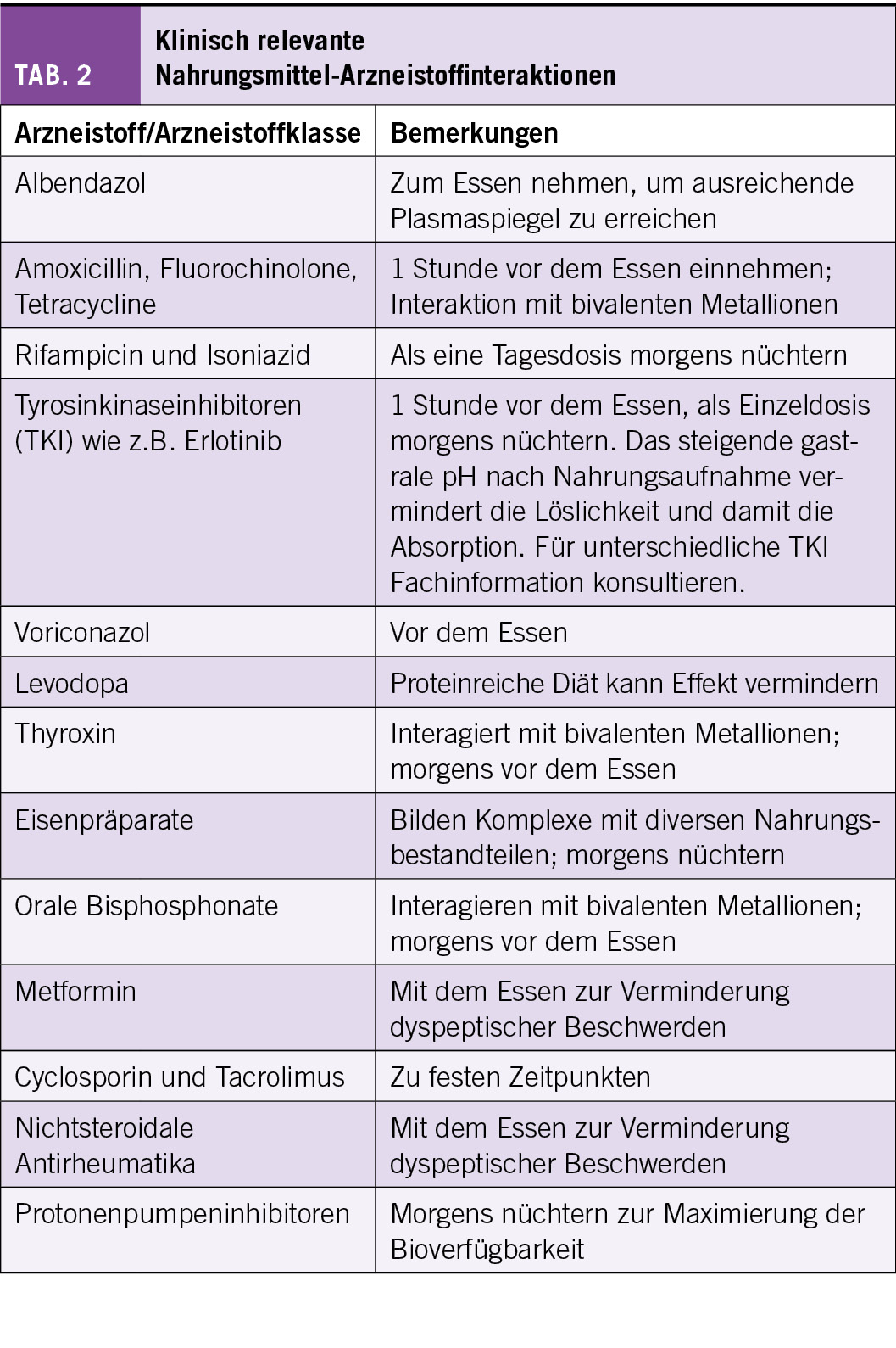 Tabelle 2 enthält eine Liste von klinisch relevanten Nahrungsmittel-Arzneistoffinteraktionen. Die Liste ist nicht vollständig; wie weiter oben ausgeführt, sollten die Empfehlungen der entsprechenden Fachinformation befolgt werden, welche auf den durch die Firmen durchgeführten Studien basieren.