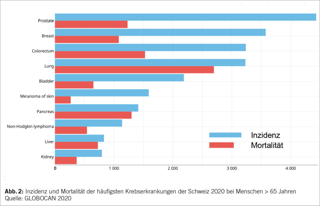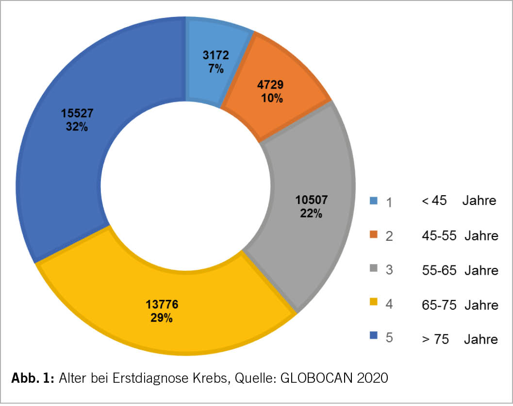 Die Lebenserwartung in der Schweiz liegt mit ca. 84 Jahren innerhalb der OECD-Länder im Spitzenbereich und ist in den letzten Jahrzehnten kontinuierlich angestiegen. Die mehr als 47’000 Krebsneuerkrankungen in der Schweiz im Jahr 2020 betrafen zu über 60% Menschen, die älter als 65 Jahre waren (Abb. 1). Besonders auffällig ist die Zunahme der Krebserkrankungen bei hochbetagten Patienten über 85 Jahren. Somit wird die Mehrheit onkologischer Behandlungen zwangsläufig im Gebiet der Geriatrischen Onkologie durchgeführt, mit den alterstypischen Herausforderungen dieses Patientenkollektivs. Vor allem Hochbetagte – nach den meisten Definitionen sind das sehr alte Menschen über 85 Jahre – sind dem Risiko sowohl einer Über- wie einer Untertherapie ausgesetzt. Daher erfordert die Betreuung dieser Patienten eine enge interdisziplinäre und interprofessionelle Kooperation.