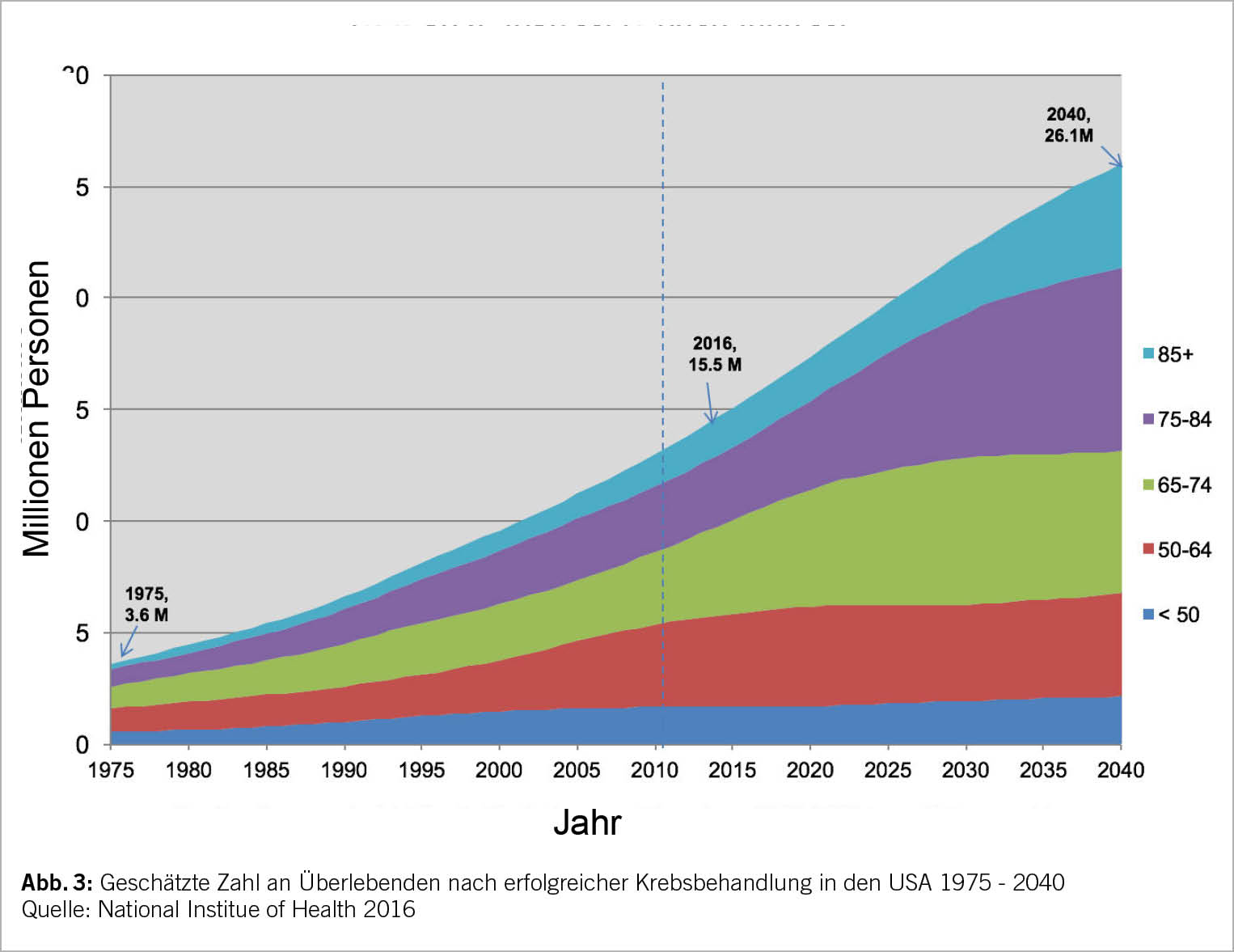Auch wenn die Erfolge neuer onkologischer Therapien sich in der Regel bei alten Menschen nur langsam in verbessertem Überleben niederschlagen (Abb. 2), muss in den kommenden Jahren ähnlich wie in den USA auch in der Schweiz mit einer zunehmenden Zahl an Überlebenden nach erfolgreicher Krebstherapie («Cancer Survivors») gerechnet werden (Abb. 3). Gerade bei alten und hochbetagten Cancer Survivors addieren sich altersassoziierte und therapiebedingte Einschränkungen. Dies muss sowohl bei der Therapieauswahl als auch bei der Nachsorge berücksichtigt werden.