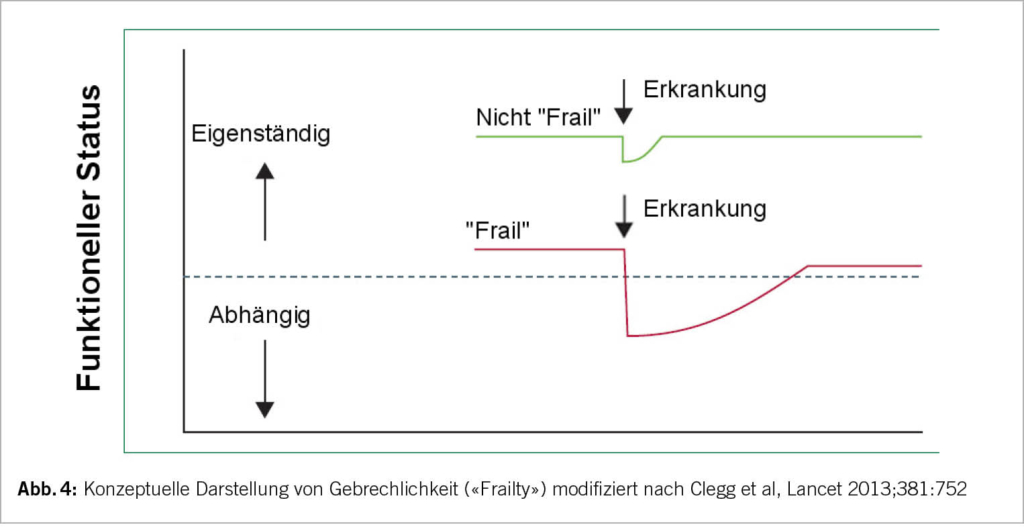 Klinische Studien zeigen, dass alte und hochbetagte Patienten bei Einsatz einer ggf. an das Alter angepassten Standardtherapie vergleichbare Erfolgschancen in Bezug auf Ansprechen und Überleben haben können wie Jüngere. Dem entspricht, dass alte und hochbetagte Patienten meist auch dieselben Hoffnungen und Erwartungen an eine Therapie haben wie Jüngere, auch wenn die Erfolge einer Therapie oft überschätzt werden (1). Dennoch sind vor allem Hochbetagte im Alltag in vielerlei Hinsicht gerade gegenüber unerwünschten Wirkungen einer Krebstherapie vulnerabler als klinische Studien dies vermuten lassen, in denen alte und hochbetagte Patienten aufgrund strikter Einschlusskriterien häufig unterrepräsentiert sind. Gebrechlichkeit («Frailty») als eine Konsequenz eines physiologischen Altersprozesses in Kombination mit durch Komorbiditäten verursachten Einschränkungen führt zwangsläufig zu einer verminderten Resilienz selbst gegenüber bei Jüngeren vergleichsweise gering ausgeprägten Nebenwirkungen onkologischer Therapien (Abb. 4) (2).