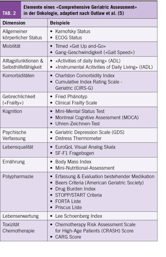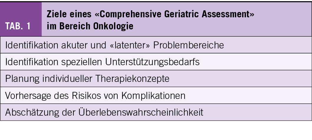 Die Abschätzung spezifischer Einschränkungen bei hochbetagten Krebskranken mittels standardisierter Tests wurde der Geriatrie entlehnt und ist für die Onkologie modifiziert worden. Die Ziele eines «Comprehensive Geriatric Assessment» (CGA) sind in Tabelle 1 dargestellt. Ein CGA ist eine multidimensionale Beurteilung eines alten und/oder hochbetagten Menschen (Tab. 2) (5). Neben den zumeist in der Geriatrie zur Anwendung kommenden zeitaufwändigen Verfahren existieren verschiedene Kurzversionen («Geriatrisches Screening»), die im onkologischen Alltag gut und mit geringem Zeitaufwand einsetzbar sind (6-10). Dies setzt allerdings voraus, dass die Ergebnisse aus dem geriatrischen Screening bzw. dem CGA für die weitere Betreuung im klinischen Alltag auch umgesetzt werden.