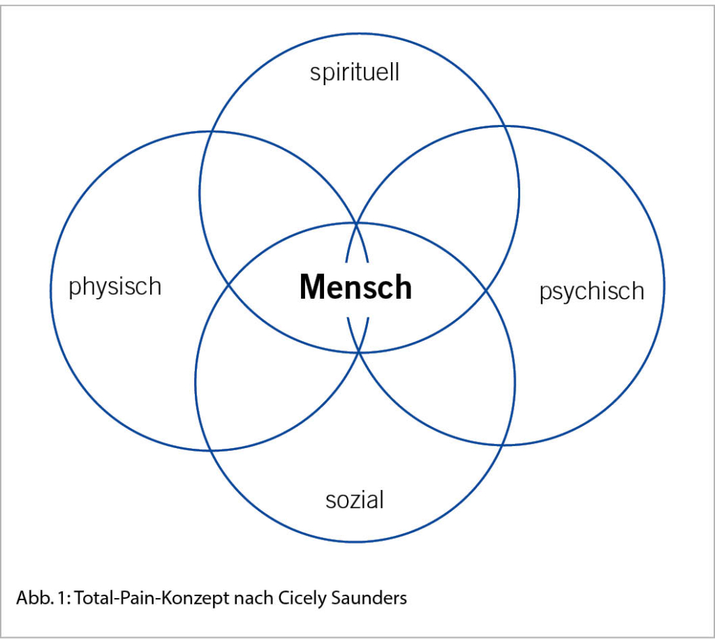 Im Allgemeinen kann gesagt werden, dass Lebensqualität das gefühlte Wohlbefinden oder die Abwesenheit von Wohlbefinden umfasst. Dabei handelt es sich um ein Konstrukt, das verschiedene Bereiche wie etwa die körperliche, emotionale und soziale Domäne beinhaltet (Spranger Mirjam et al., 1993), wie es unter anderem im Total-Pain-Konzept nach Cicely Saunders beschrieben wird (Abb. 1).