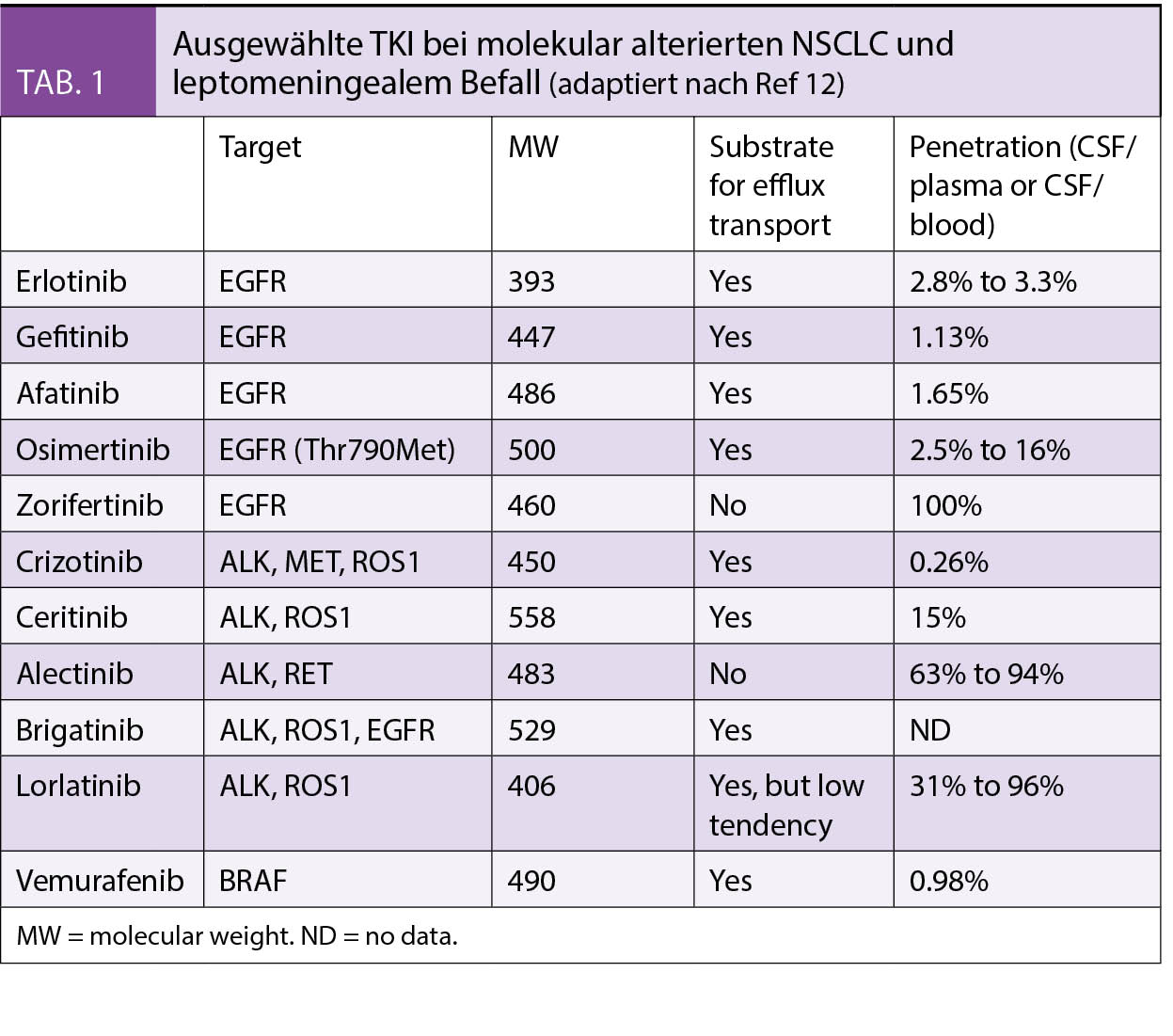 ZNS wirksam sind zielgerichtete TKI mit einem kleinen Molekulargewicht (400-500 D) und fehlender Abhängigkeit vom Efflux-Transporter P-Glykoprotein (Pgp). (Tab. 1) (12)