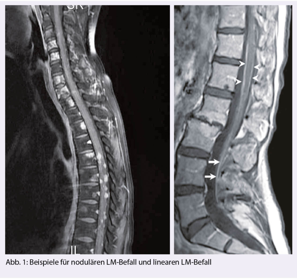 Man unterscheidet einen nodulären Tumorbefall, an den Meningen adhärent, eine tapetenartige Auskleidung der Meningen und frei flottierende Tumorzellen oder eine Kombination dieser Manifestationen (Abb. 1). Es ist nachvollziehbar, dass bei der nodulären, adhärenten Form, keine Tumorzellen im Liquor fassbar sein können.