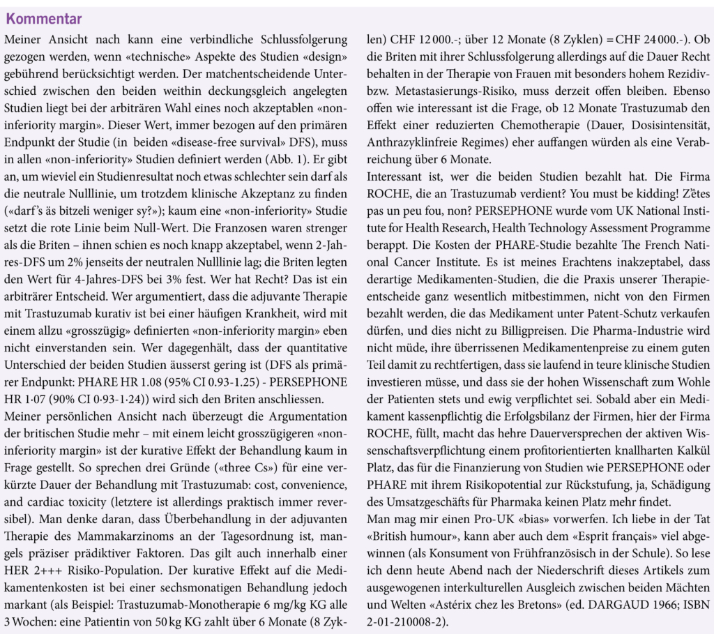 Zusammenfassung: Zwei Studien, praktisch gleich aufgegleist, im selben LANCET-Heft publiziert, und doch mit diametral verschiedenen Schlussfolgerungen. Sowohl die französische (PHARE) als auch die britische Studiengruppe (PERSEPHONE) fragten, ob bei der adjuvanten Therapie des HER2 POS Mammakarzinoms eine Behandlung mit nur 6 Monaten Trastuzumab nicht wirklich schlechter wäre als die Therapie mit der heutigen Standarddauer von 12 Monaten. Die frankophone PHARE Studie folgert, 12 Monate Verabreichungsdauer des Antikörpers bleibe Standard, die anglophile PERSEPHONE Studie kommt genau zum gegenteiligen Schluss. Wer hat Recht? La haute cuisine des essais cliniques de France (PHARE), oder Fish & Chips (PERSEPHONE)? L’Élysée, oder 10 Downing Street?