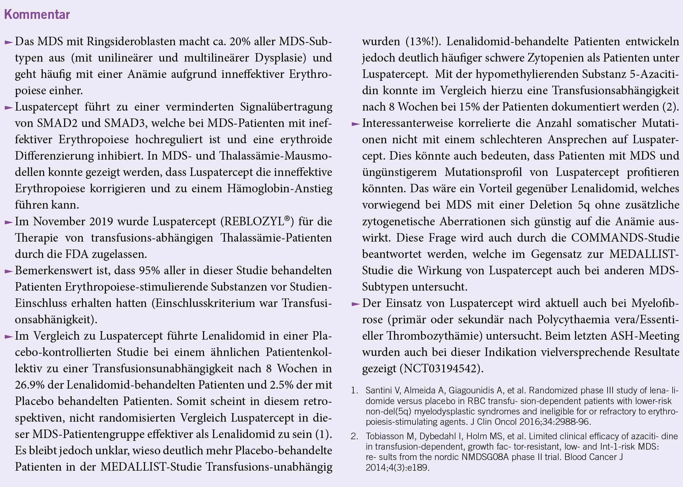 Patienten mit Anämie und myelodysplastischen Syndromen (MDS) von geringerem Risiko, bei denen die Therapie mit Erythropoiese-stimulierenden Mitteln nicht wirksam ist, werden im Allgemeinen von Erythrozyten-Transfusionen abhängig. Luspatercept, ein rekombinantes Fusionsprotein, das transforming growth facotr β superfamily Liganden zur Reduzierung der SMAD2- und SMAD3-Signalübertragung bindet, zeigte vielversprechende Ergebnisse in einer Phase 2-Studie.