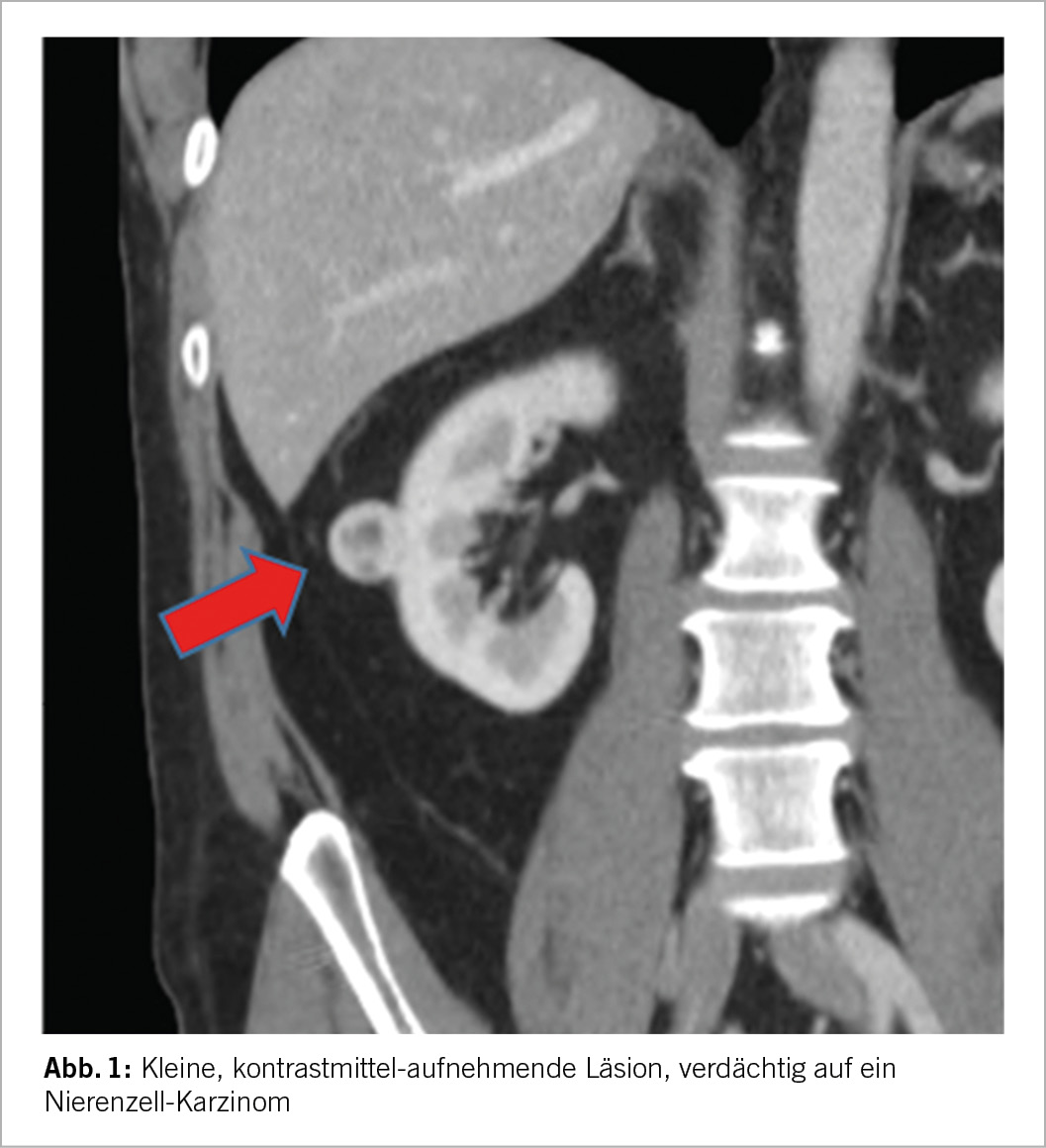 Durch den vermehrten Einsatz von Schicht-Bildgebungen wie CT oder MRI kam es in den letzten Dekaden zu einem deutlichen Anstieg der Inzidenz von kleinen Nierenläsionen unklarer Dignität, im angelsächsischen SRM (small renal mass) genannt (1). Solche sind meist zufällig detektierte, kontrastmittelaufnehmende Läsionen ≤4cm, solide oder komplex-zystisch und somit bildmorphologisch verdächtig auf ein klinisches T1a Nierenzellkarzinom (2). Bei diesen Läsionen handelt es sich um eine heterogene Gruppe von Tumoren, wobei 20-30% benigne und 70-80% maligne sind (3, 4). Von den bösartigen Tumoren stellt die Mehrzahl (80%) Niedrig-Risiko Karzinome dar (5) mit entsprechend tiefem Metastasierungs-Risiko (6), etwa 20% sind aber high grade Karzinome mit Invasions- und Metastasierungs-Potenzial (4). Mit anderen Worten, von zehn dieser inzidentell diagnostizieren kleinen Nierentumoren sind im Durchschnitt bis zu drei gutartig, von den sieben Bösartigen haben aber nur ein bis zwei ein höheres aggressives Potenzial. Das Gesamtrisiko einer Metastasierung in dieser Gesamt-Tumorgruppe liegt <2% bei reiner Beobachtung (7). Somit ist die richtige Selektion an zu treffenden Massnahmen von grösster Wichtigkeit, um sowohl Über- als auch Unter-Behandlung zu vermeiden; das Management einer SRM ist abhängig von mehreren Faktoren, die wesentlichsten sind i) die bildmorphologischen Charakteristika der SRM, ii) Patientenfaktoren wie Alter, respektive Lebenserwartung aber auch Patientenpräferenz, iii) Co-Morbiditäten wie vorausgehende oder bestehende Malignome oder Niereninsuffizienz, iv) Vor-Operationen im Abdomen sowie v) allfällige Resultate einer bioptischen Abklärung der SRM. Diese Arbeit soll diese Aspekte im Management einer SRM beleuchten und die aktuellen Behandlungsstrategien kurz darstellen.
