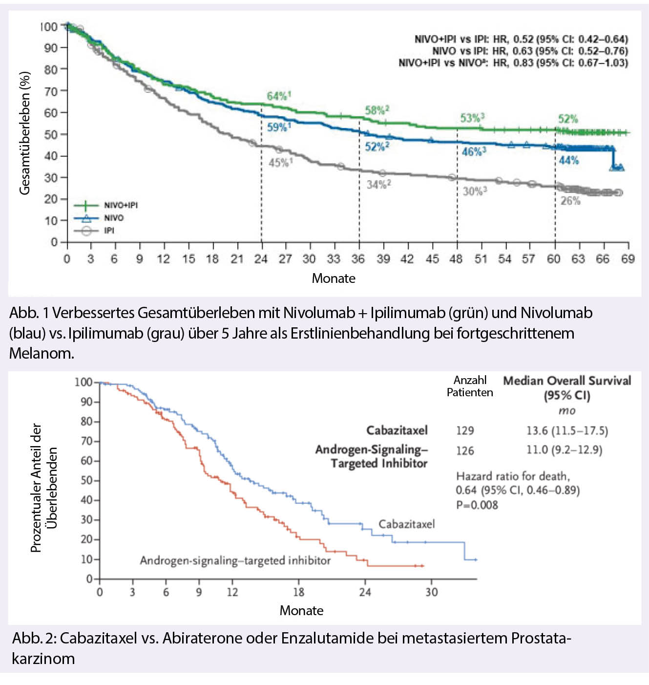 Trotz grossen Fortschritten bei der Behandlung des Prostatakarzinoms sind viele Fragen zur Sequenz der verschiedenen Medikamente und der «best use of» nach wie vor unklar. Einen Puzzle-Stein zum verbesserten Verständnis einer solchen Frage wurde noch im Dezember im New England Journal of Medicine (5) publiziert. Hierbei ging es darum herauszufinden, ob nach einer Vorbehandlung mit Docetaxel und einem Rezidiv innert 12 Monaten unter Abiraterone oder Enzalutamid erneut eine Chemotherapie, diesmal mit Cabazitaxel oder dem alternativen Androgen-Blocker, durchgeführt werden soll. Dabei stellte sich klar heraus, dass die Behandlung mit Cabazitaxel überlegen ist bezgl. progressionsfreiem Überleben (4.4 versus 2.7 Monate; HR 0.52), dem Gesamtüberleben (13.6 versus 11.0 Monate; HR 0.64) sowie diversen anderen Endpunkten (Abb. 2). Cabazitaxel darf somit als Standardtherapie in dieser Situation gelten.